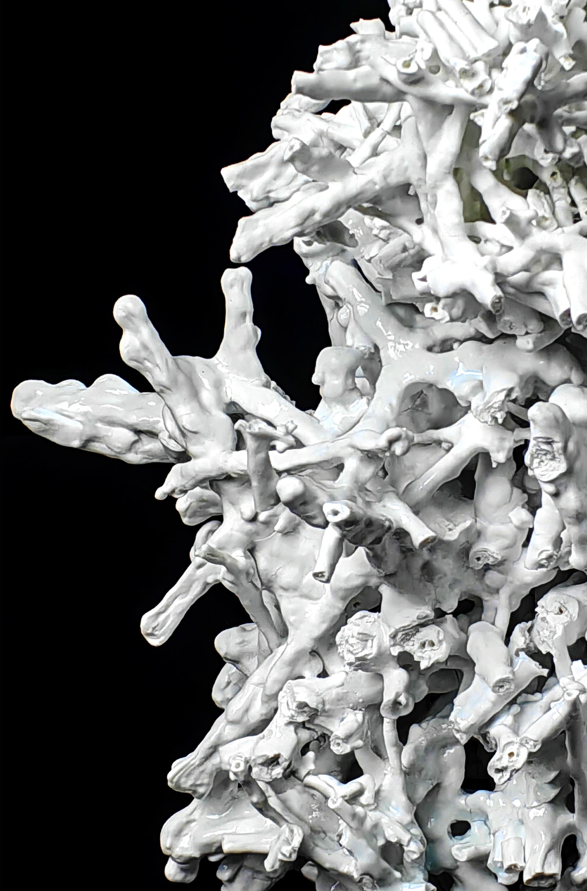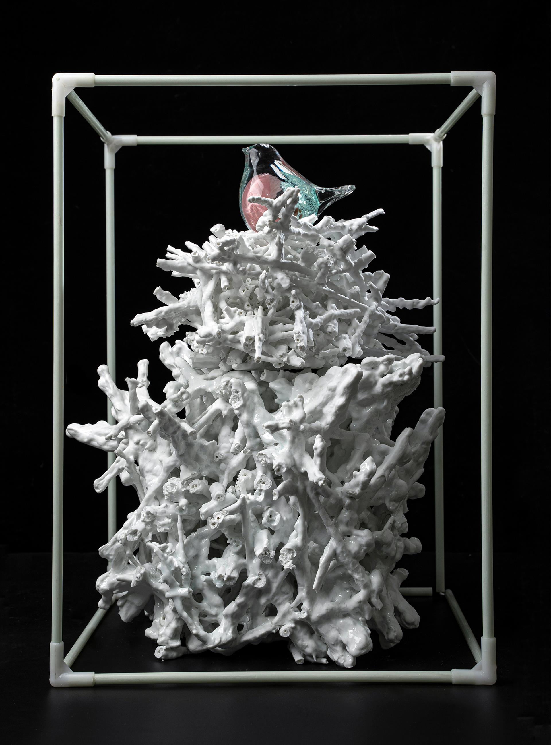 In the contemporary art context, the work "Within a Square Inch" uses cotton rope fibers and ceramics as mediums to construct a deep metaphorical system that represents the relationship between the inner world and the external environment. The material differences between the two materials become an important visual language for interpreting the mental state of the subject. The hard and regular characteristics of the ceramics after high-temperature firing symbolize the principles and value systems that the subject adheres to, and their constant physical properties reflect the stable foundation of the human spiritual world; while the soft and extensible characteristics of the cotton rope fibers imply the adaptability and flexibility of the individual in the external environment, and their intertwined and winding form concretely presents the complex network of life experiences and emotional memories. The naming of the work "Within a Square Inch" contains dual meanings: it points to the finiteness of the physical space, and also metaphorically represents the self-sufficiency of the inner world. In the context of traditional culture, "square inch" originally refers to the inner self, and later is extended to the spiritual core field; "between" emphasizes the self-contained existence state within the given boundaries. This concept constructs a speculative framework of spatiality and subjectivity, revealing the self-consistency achieved by the individual through adaptive strategies in the limited field. At the level of造型 language, the work presents a distinct binary tension. The external part is shaped by regular geometric bodies to create clear boundaries, symbolizing the self-segmentation and spiritual autonomy of the inner world; the internal part is constructed through the interweaving of cotton rope fibers and ceramics, creating a complex material dialogue network. The form of fibers penetrating the rigid framework of ceramics is both the embodiment of thoughts at th