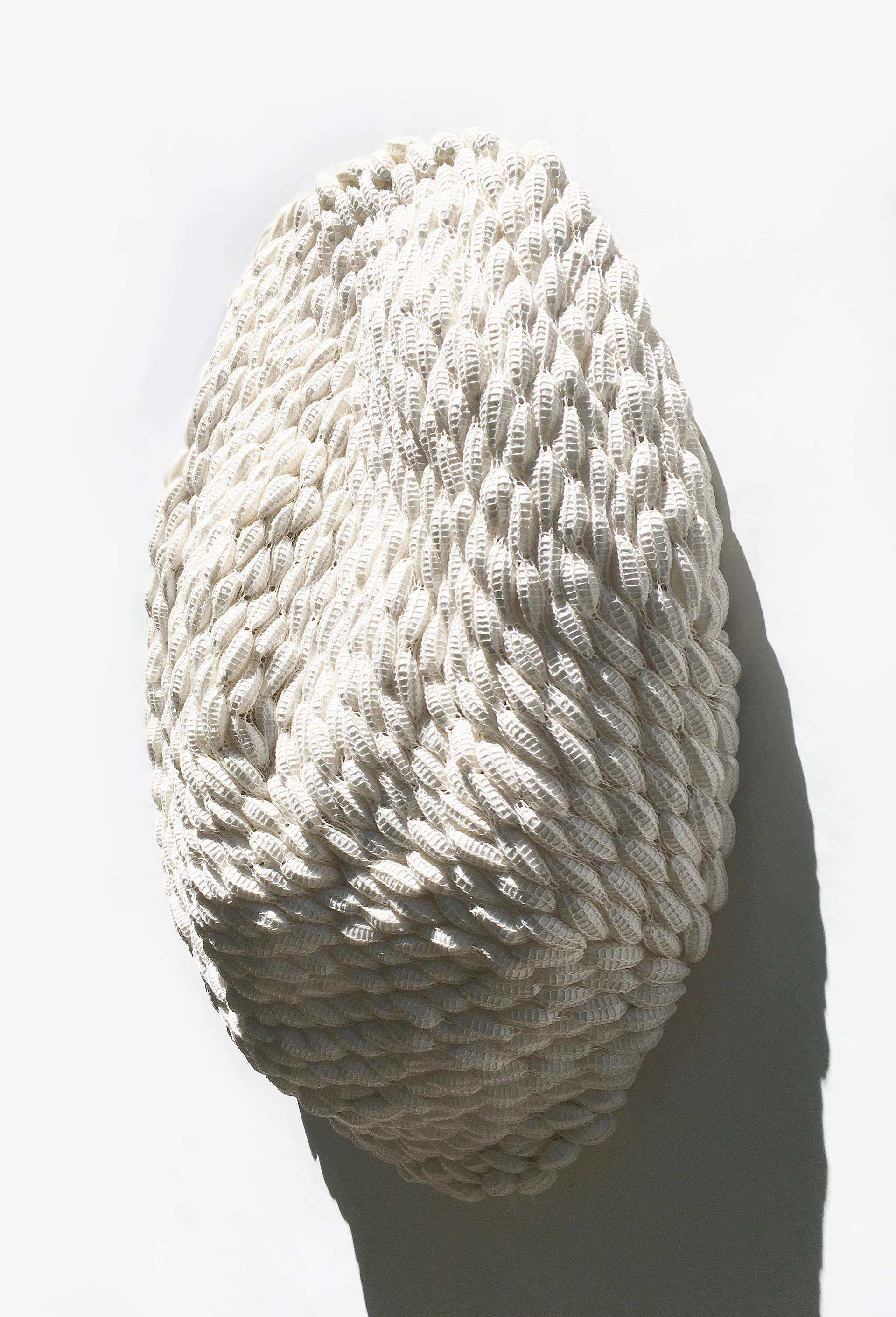 Sensitive is a porcelain grain relief that brings together translucent porcelain grains and an airy knitted cord of mercerized cotton, creating a subtle interplay of texture and light. The porcelain grains are miniature (≃ H 4-4'5 cm x W 1.5-2 cm) and ultralight pieces with thin and translucent walls created one by one thanks to the technique of wool embalmed with porcelain. By dipping thick strands of carded wool into liquid porcelain, the clay naturally accumulates at the tips, forming slender membranes reminiscent of cocoons. After post-finishing and firing the ceramic at 1260 °C in an electric kiln, only the extremely delicate clay remains, with a texture that subtly recalls a dried leaf. This approach challenges and redefines the thresholds of porcelain’s finesse and luminosity. The grains are ultimately brought together by an airy, hand-knitted cord, meticulously stitched onto a metallic thread canvas crocheted into a delicate mesh. This innovative method explores the subtle interaction between density and lightness. Sustainability is at the very core of my artwork. I work solely with natural, locally sourced materials, devising methods that minimize the use of raw resources and leave behind only the slightest trace of biodegradable waste. Each work is meticulously handcrafted by natural daylight and fired through locally sourced renewable energy, reinforcing a practice deeply rooted in ecological consciousness.