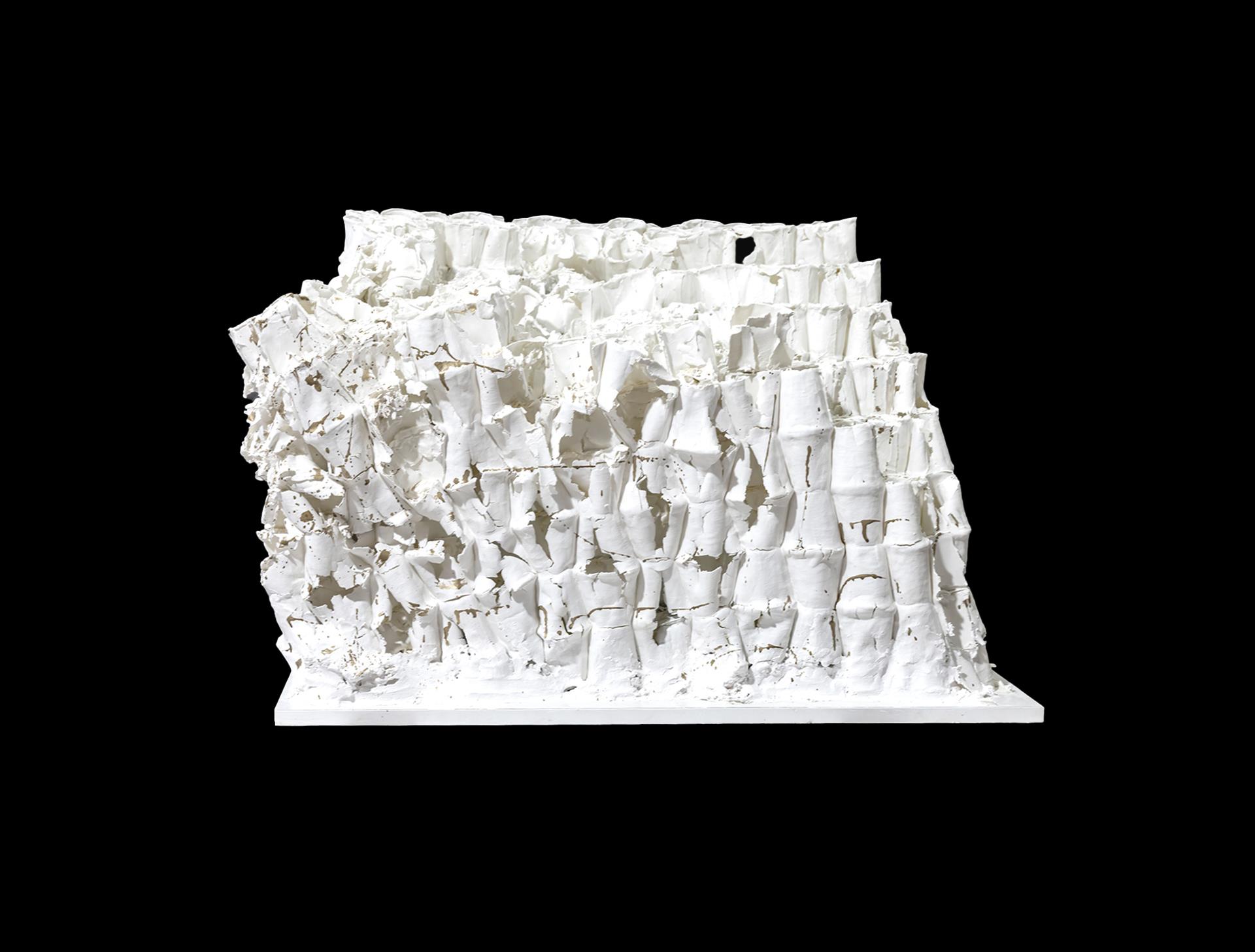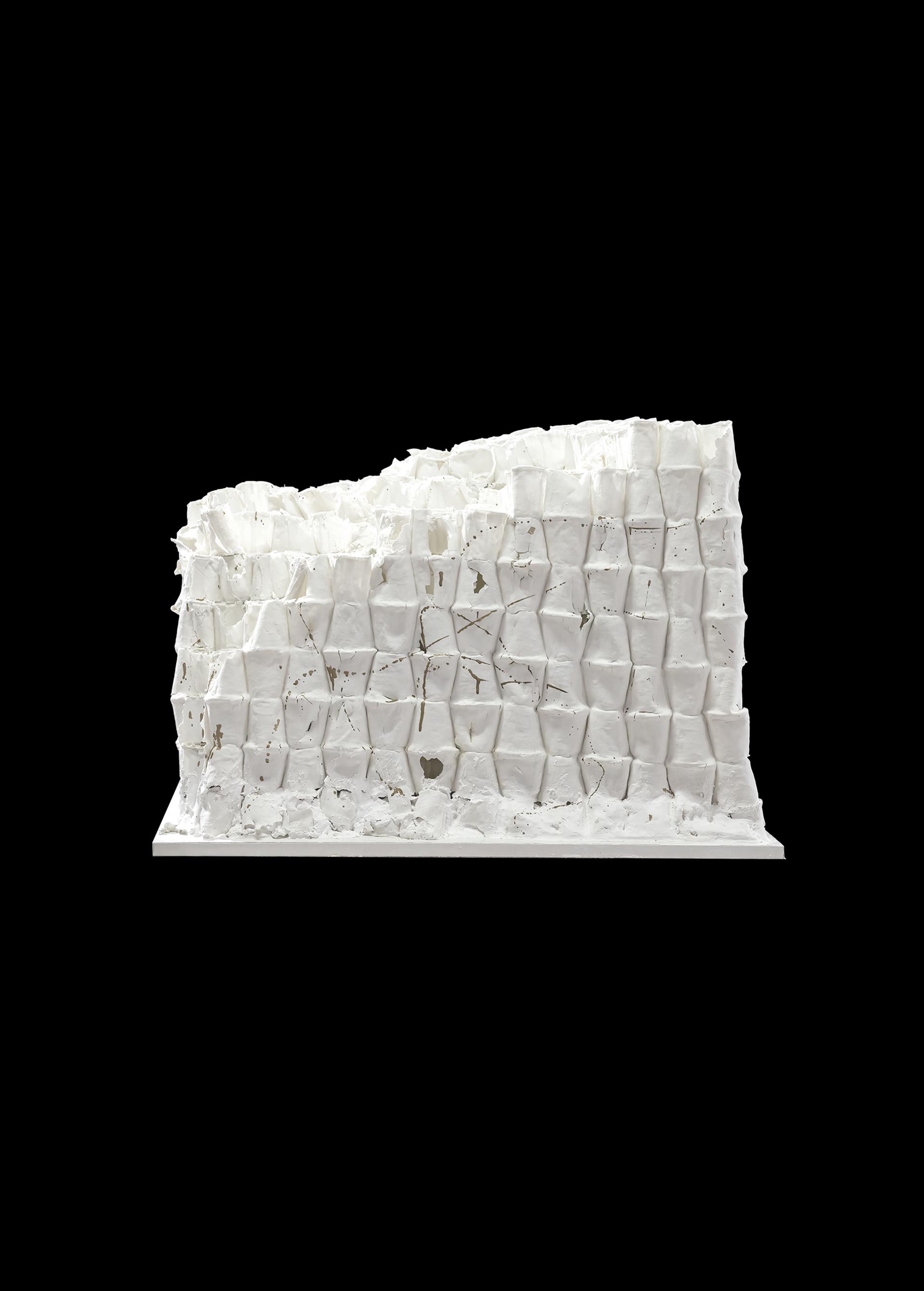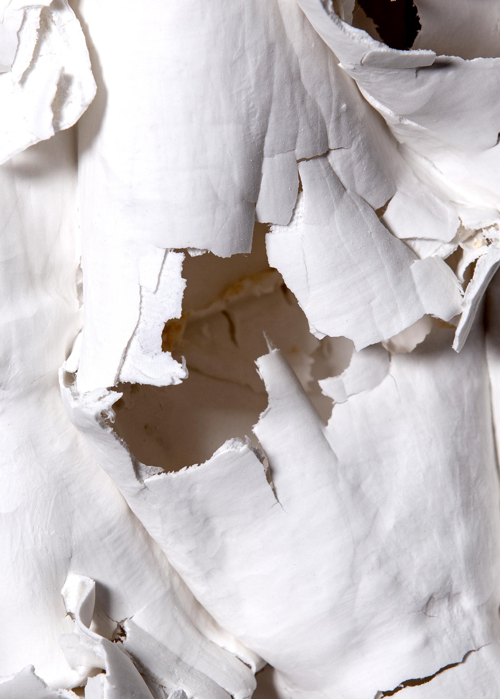 This work is composed of disposable paper cups, supplemented by some soft materials, stacked and combined, brushed with high white mud of different thicknesses on the outside of the modeling, and fired in a 1280-degree high-temperature gas kiln.After firing, there are different firing states such as cracking, collapse, and crushing, which preserves the organic traces left by the soft material and presents a variety of different ceramic material texture effects. The natural purity produced by the combination and fusion of various media and ceramic materials under high temperature melting fully reflects the aesthetic taste of the beauty of ceramic texture. A small amount of plaster is used at the bottom of the work to rest and shape, so that the overall shape is more stable and upright.