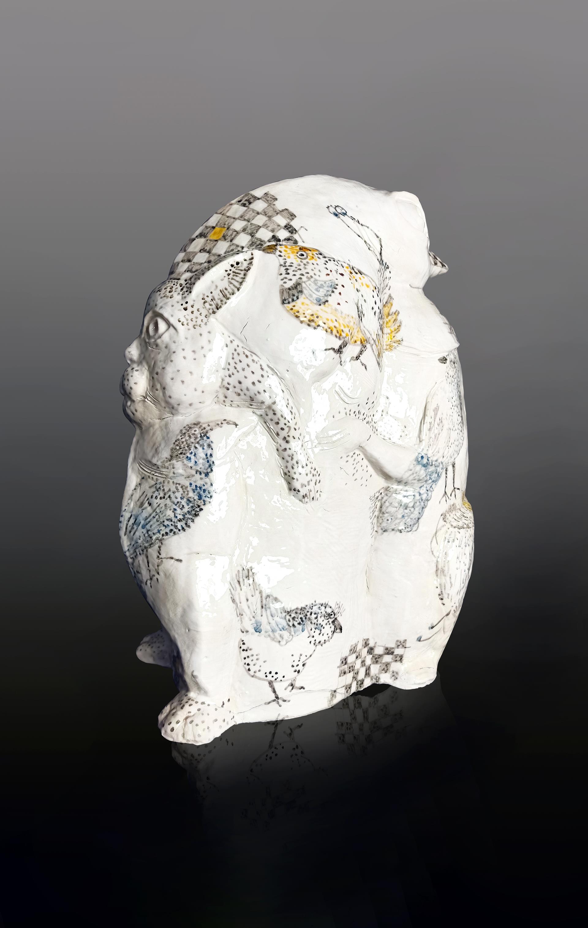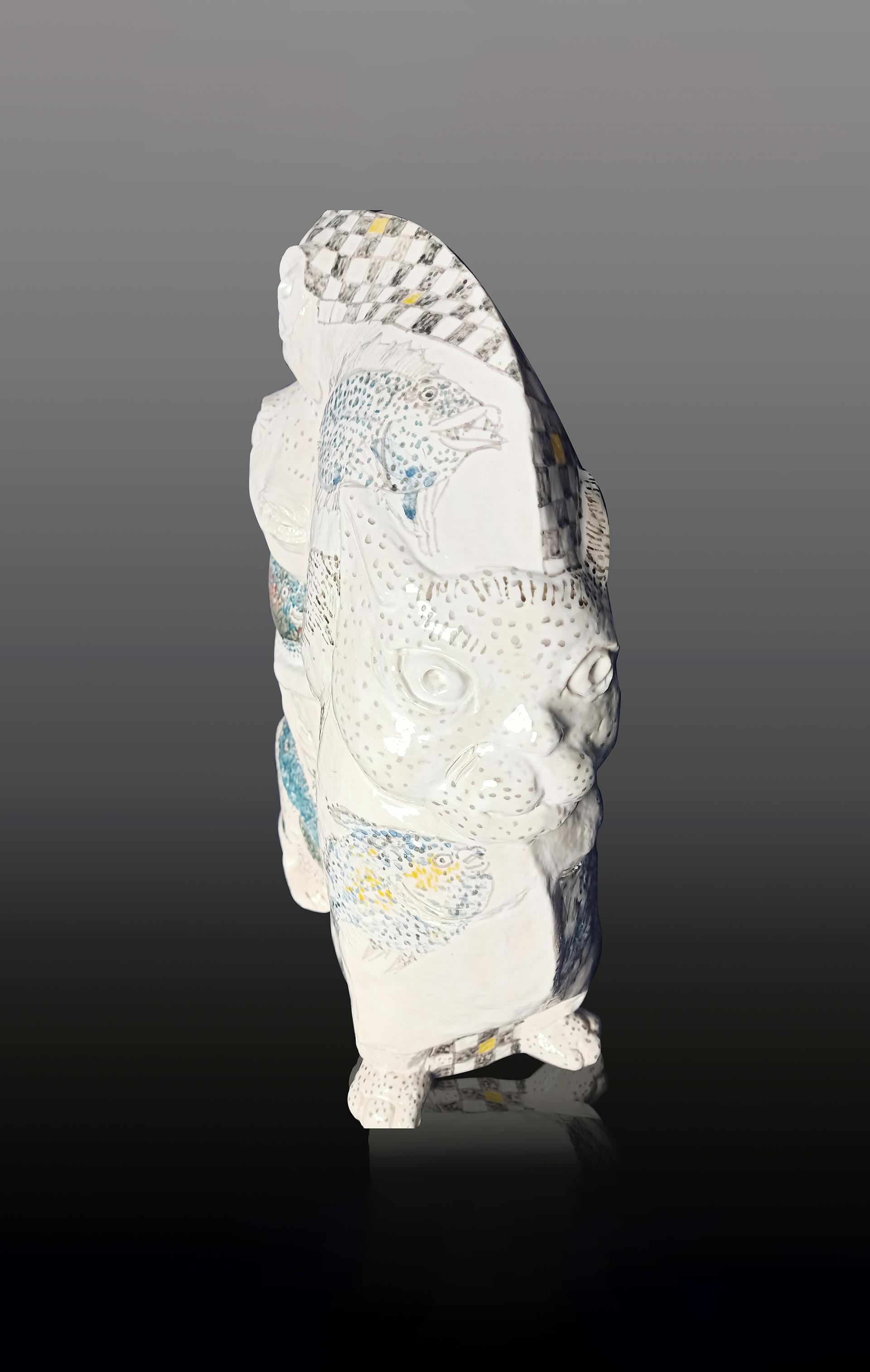 This work relies on the unique material of Dehua's "Chinese White" ceramics, creatively integrating fish and birds, two natural creatures, to create a unique artistic image. Dehua's "Chinese White" porcelain is delicate and warm, like grease and jade, setting a pure and elegant tone for the work. The work is based on the form of a bird, with soft and full body lines, slightly raised head, and gentle gaze, conveying a sense of tranquility. Above the bird, the image of a fish is vividly presented. Fish is drawn with delicate brushstrokes and rich colors, with vivid details and harmonious color matching. The main tone is blue-green, with red and yellow accents, creating a rich layering. The combination of fish and bird is natural and clever, like fish swimming freely on the bird's body, and birds guarding the fish, showing the beauty of harmonious coexistence. Fish symbolizes freedom, agility, and the source of life, while birds represent freedom, dreams, and transcendence. The fusion of the two symbolizes the yearning for a free and beautiful life, and also expresses the interdependence of natural life. This idea breaks the traditional ceramic expression pattern and endows the work with new connotations. With the material charm and exquisite craftsmanship of Dehua's "Chinese White", the work expresses praise for nature, life, and freedom in a unique artistic language, and is a masterpiece that combines beauty and connotation.