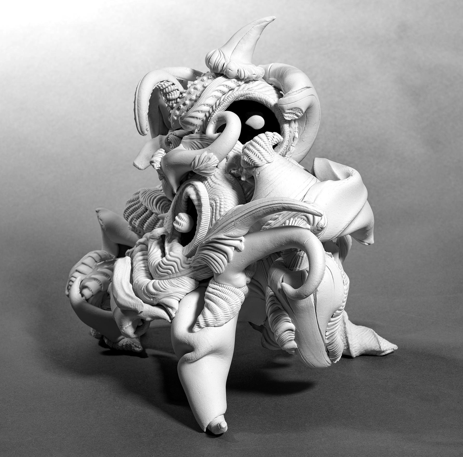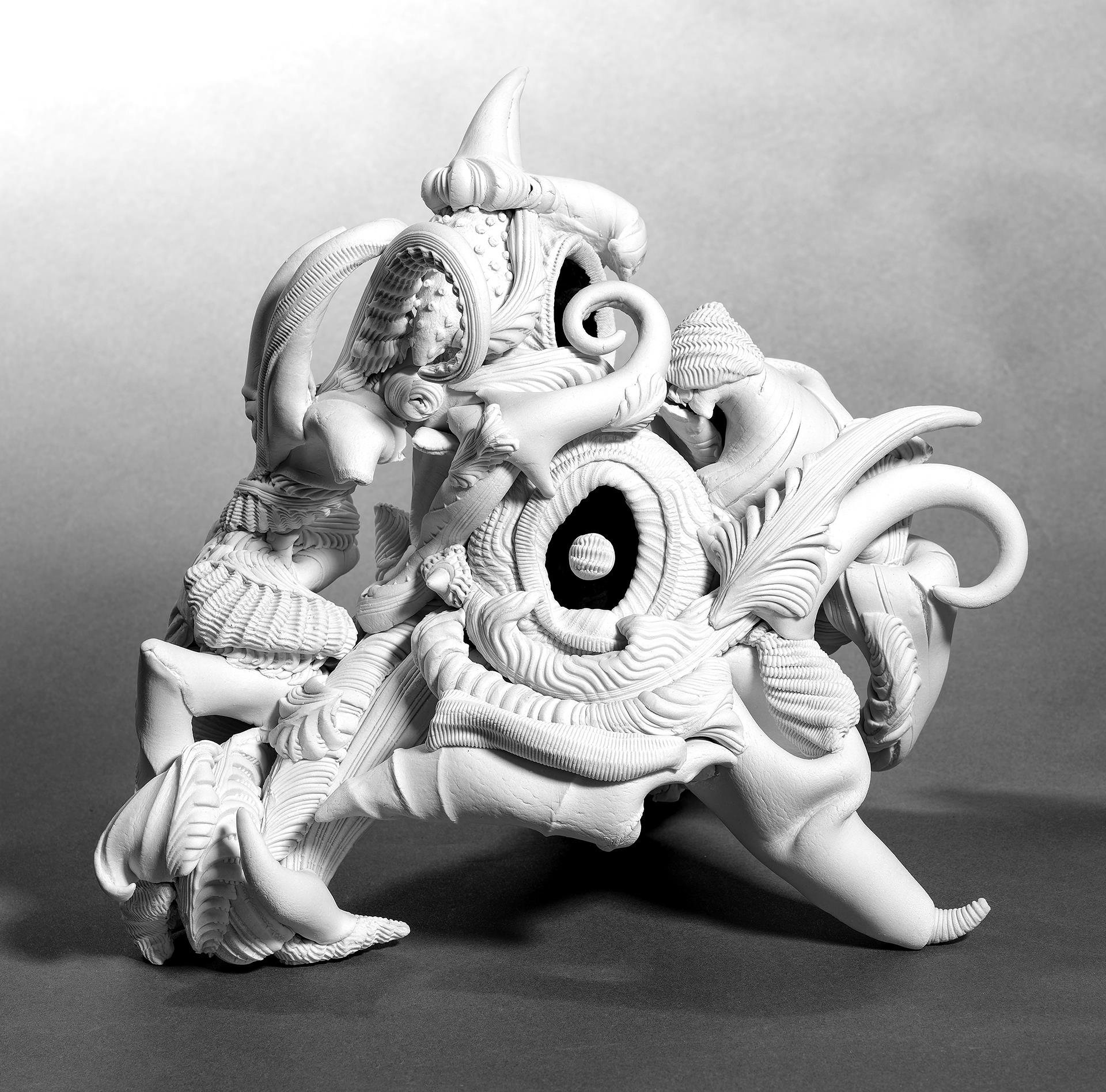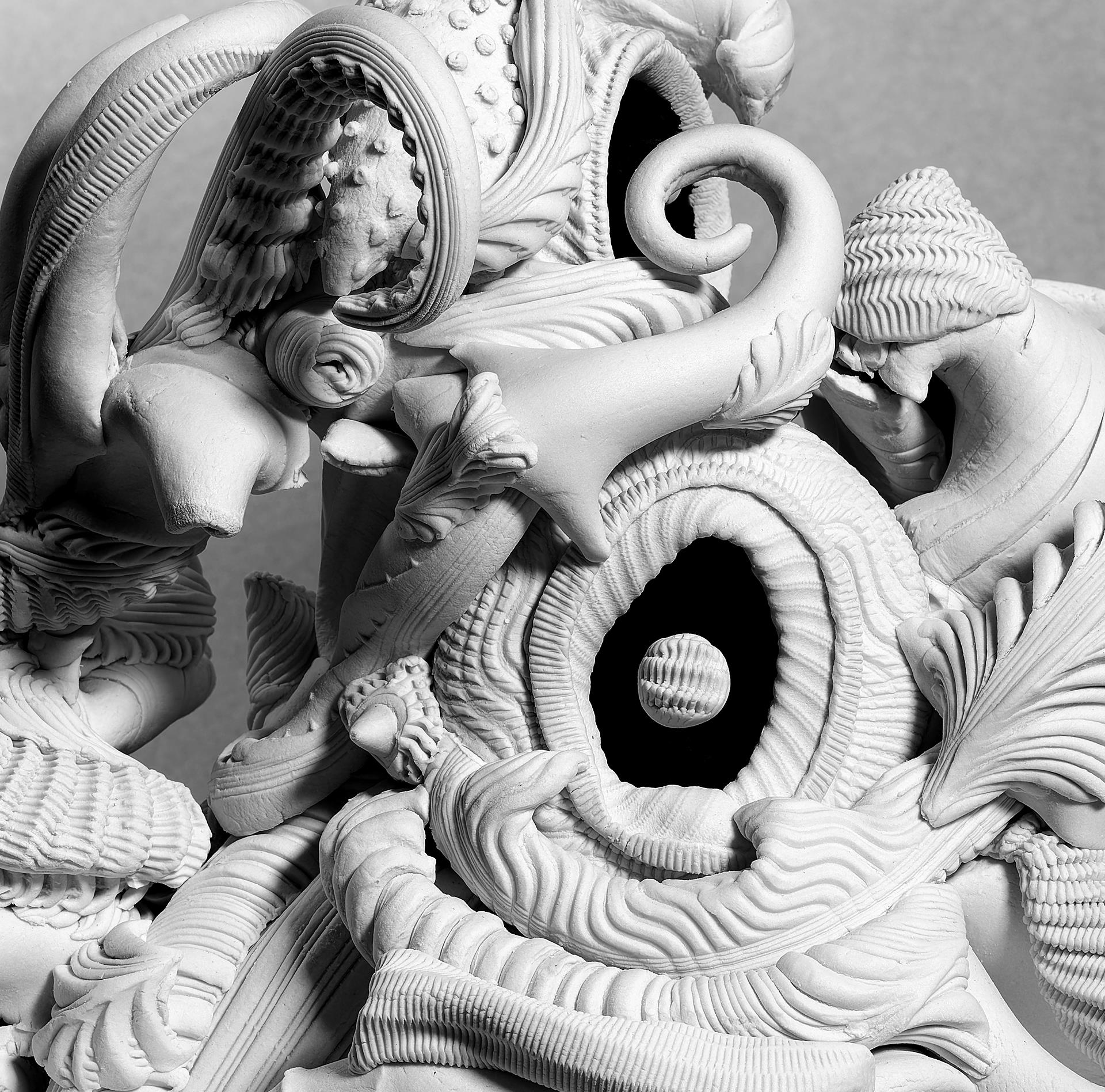My sculptures re-imagine Baroque grandeur by stripping away its ornamental excess, drawing upon the natural morphology of Ernst Haeckel's organic illustrations, the constructed reliefs of Lee Bontecou's wall sculptures, and Louise Nevelson's monochromatic works. I create an imagined biology that ranges from the microscopic to the macroscopic, blending animal and plant forms with a new perspective. The all white forms depart from the color of living nature, yet their shapes and undulating patterns create an animated sense of motion and change that seemingly makes them feel alive.