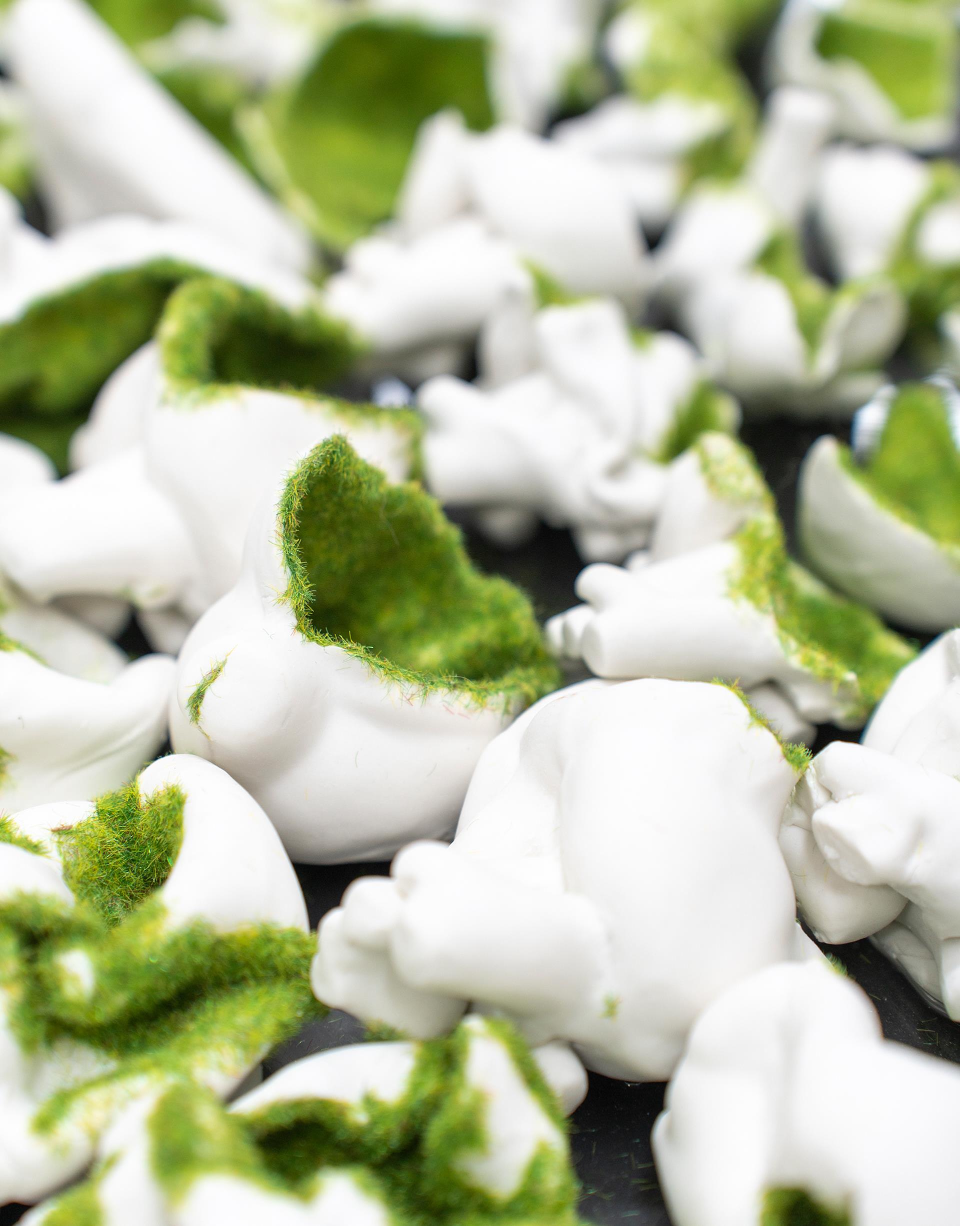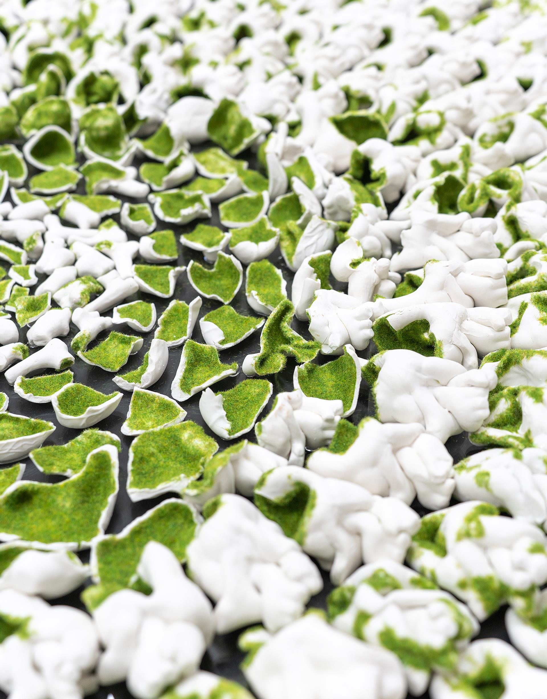 This ceramic piece, with its unique heart shape and concentric circle arrangement, showcases the fragility and tenacity of life. The center of the work is densely filled with green fragments, gradually transitioning to white as it moves outward, forming a vibrant and lively disc image. The endless circularity of the circle gives off a powerful and warm energy, allowing people to feel the infinite possibilities and new hope of life. This is not only a visual enjoyment but also a profound understanding of vitality and resilience. It is not merely a decoration but more like a story, telling of the tenacity and beauty of life. It is an exploration of the essence of life and a celebration of existence. It tells us that even in fragmentation, we can find the power of rebirth, and even in chaos, there is order.