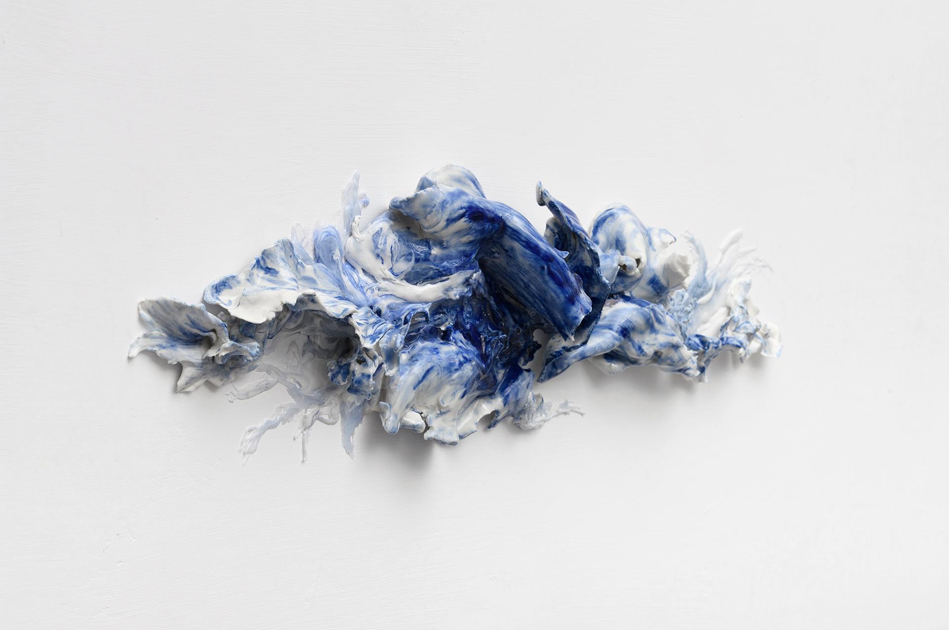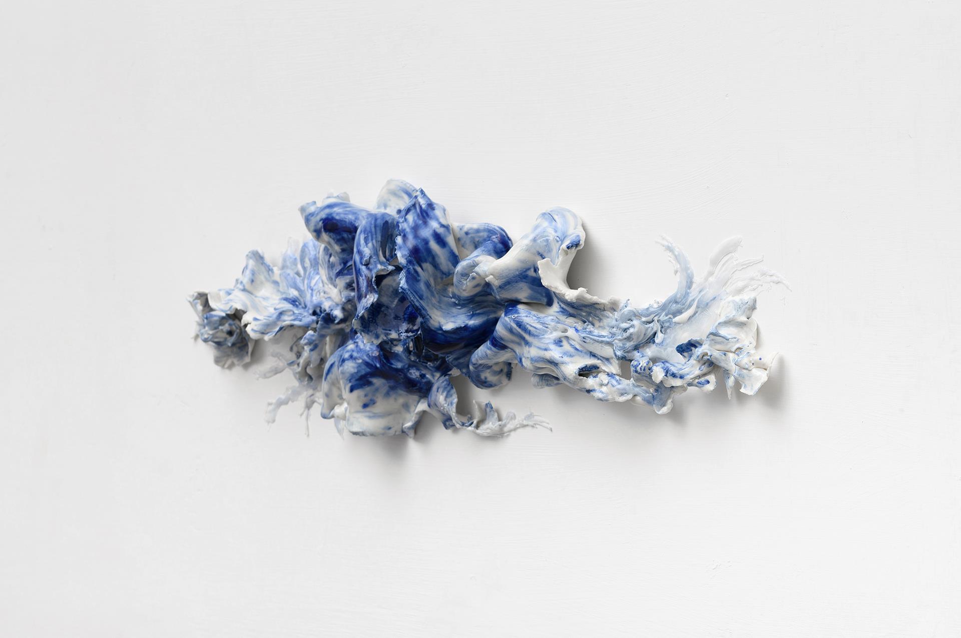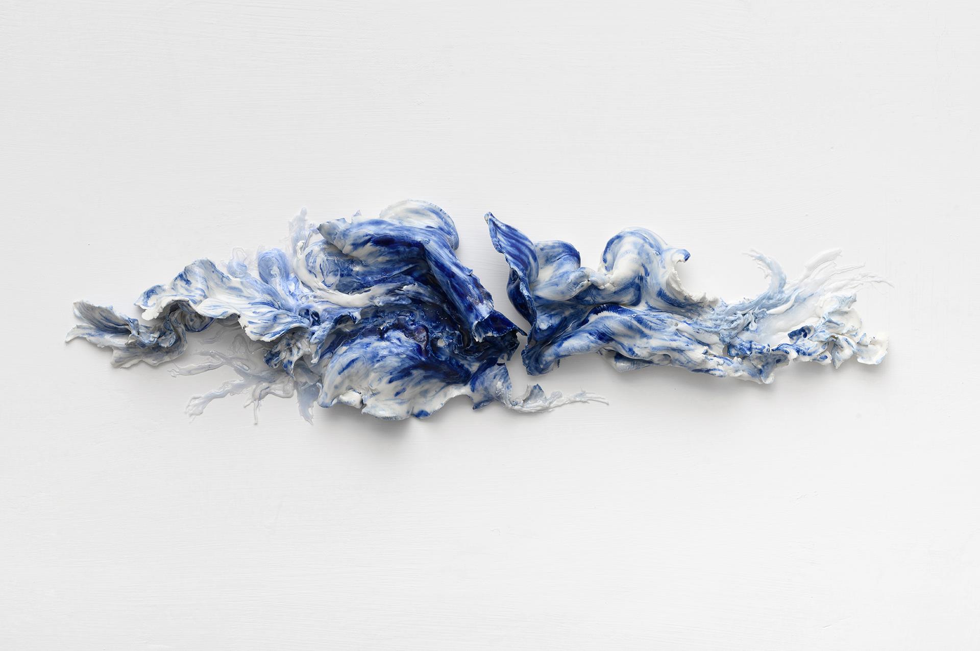 In my practice space is conceived as a plastic volume—imaginary but, above all, psychosomatic. The relationships between the viewer, the artwork, and the architecture become the cornerstone of my artistic process: on one hand, the physical space inevitably affects the sensory perception of the visitor; on the other, the artistic intervention brings about profound and decisive changes in the objective perception of the external world. The title of the work: "A-Mare", plays on the Italian words ‘amare’ (to love) and ‘mare’ (sea), weaving together the intimacy of love and the boundless mystery of the ocean. The title reflects a delicate balance between intimacy and infinity, suggesting a journey through feelings as deep and mysterious as the sea itself. The piece emerges from recent personal reflections on love and relationships — experiences that have stirred deep emotional currents and continue to echo through my practice. Like two waves with opposing flows and forces that, despite their contrasts, find unity in defining a shared horizon, this tension between opposing currents become the emotional core of the piece. The installation is composed of two elements that embrace and adapt to the surrounding architecture, much like these waves interact and converge in a fluid dance. Made from white and blue porcelain — the work introduces the translucent presence of resin, which binds and interacts with porcelain, creating a living, organic dialogue between past and present, fragility and resilience, like sea foam catching the sun’s fleeting glow. Through this synthesis, the installation reinterprets the heritage of blue-and-white porcelain, giving it new life in a contemporary form that explores both materiality and meaning. It invites viewers to contemplate the fragile balance between opposition and unity, passion and calm, heritage and innovation — where love and the sea meet in a dance both intimate and infinite.
