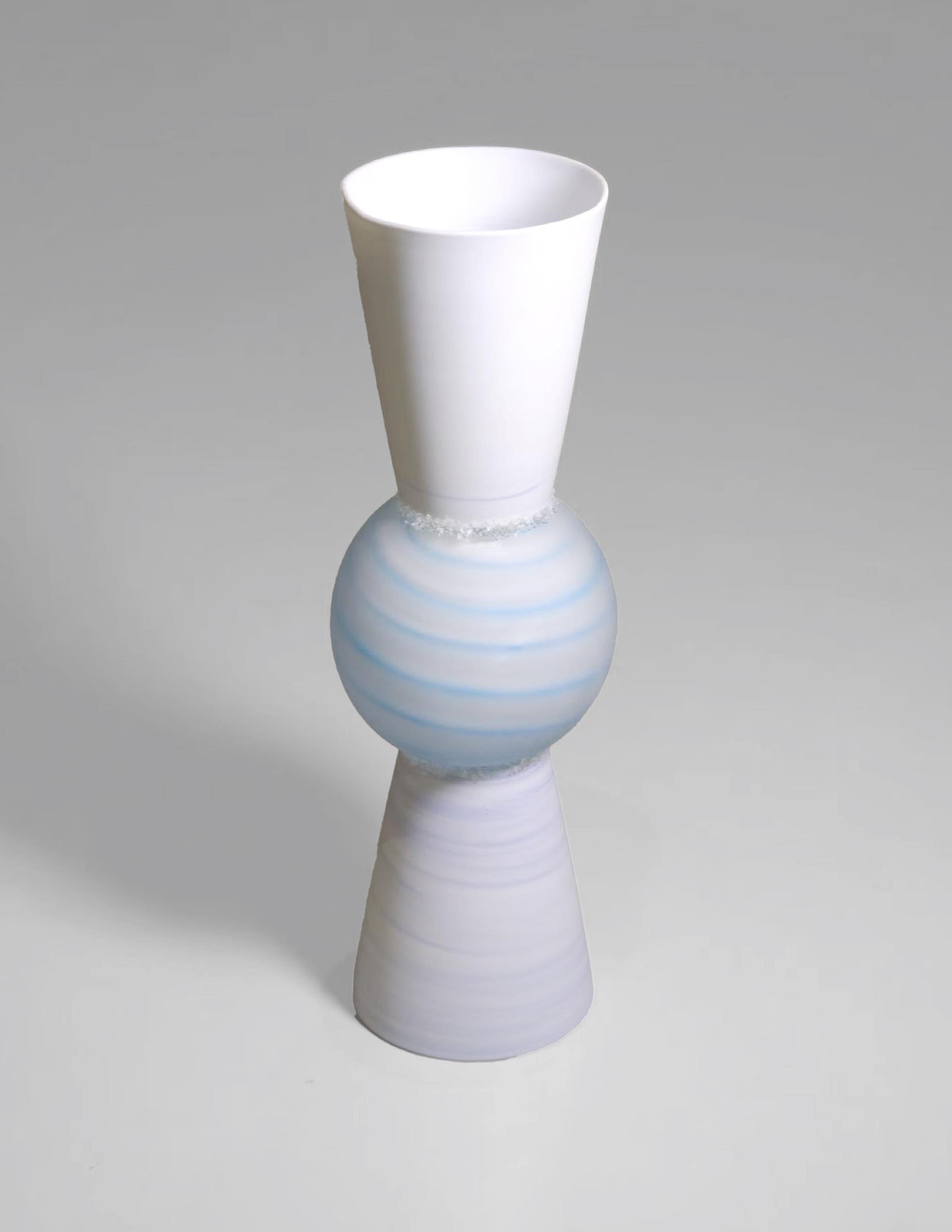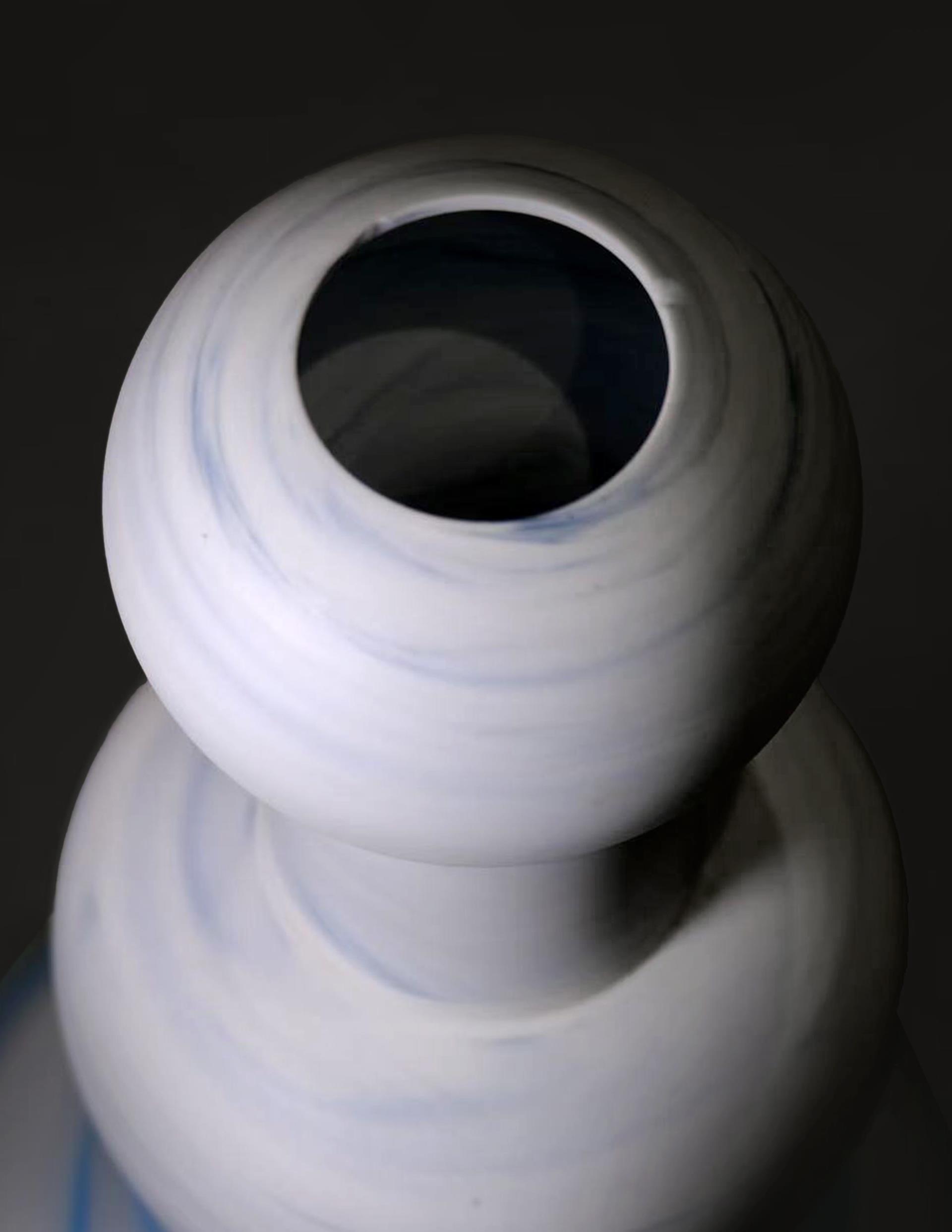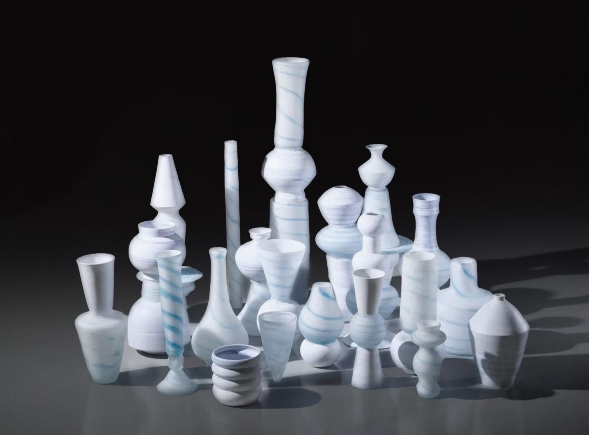 Convergence of Realms is a cross-media meditation on material dissolution and rebirth. Dozens of ceramic and glass vessels – varying in height and form – are arranged in a staggered three-dimensional array, evoking a silent yet vibrant "forest of vessels." Cobalt-blue vortices swirl across each vessel's surface. These patterns transcend ornamentation: they are traces of material dialogueunder transformative conditions. At its core, the work engineers a convergence of realms – dissolving the boundary between the liquid luminosity of glass and earthen resilience of ceramic. Forced into shared creation, these opposing materials permeate one another. The resulting objects defy categorical purity: their fused bodies manifest a new substance where fluidity and solidity coexist. The undulating vessel-forest embodies integration . Its rhythmic topography constructs spatial harmony while symbolizing emergent unity: where once stood division, now flows symbiotic vitality. Glass and ceramic become interdependent organisms – their properties circulating through the ecosystem like shared breath. Thus, Convergence of Realms transforms craft into alchemy. The blue vortices capture the moment of material transcendence; the forest-array declares nature’s logic reborn in art. Viewers witness the eternal instant where boundaries evaporate – and discover the beauty of coalescence.