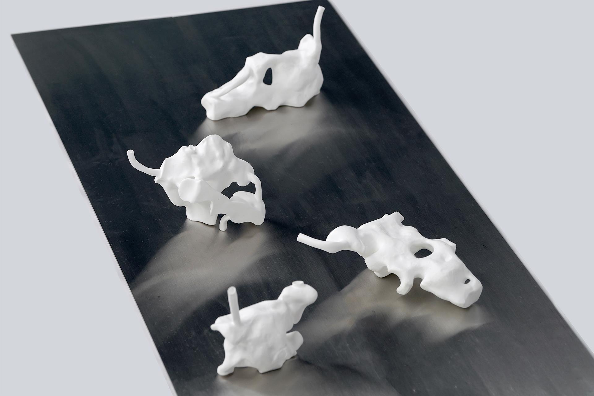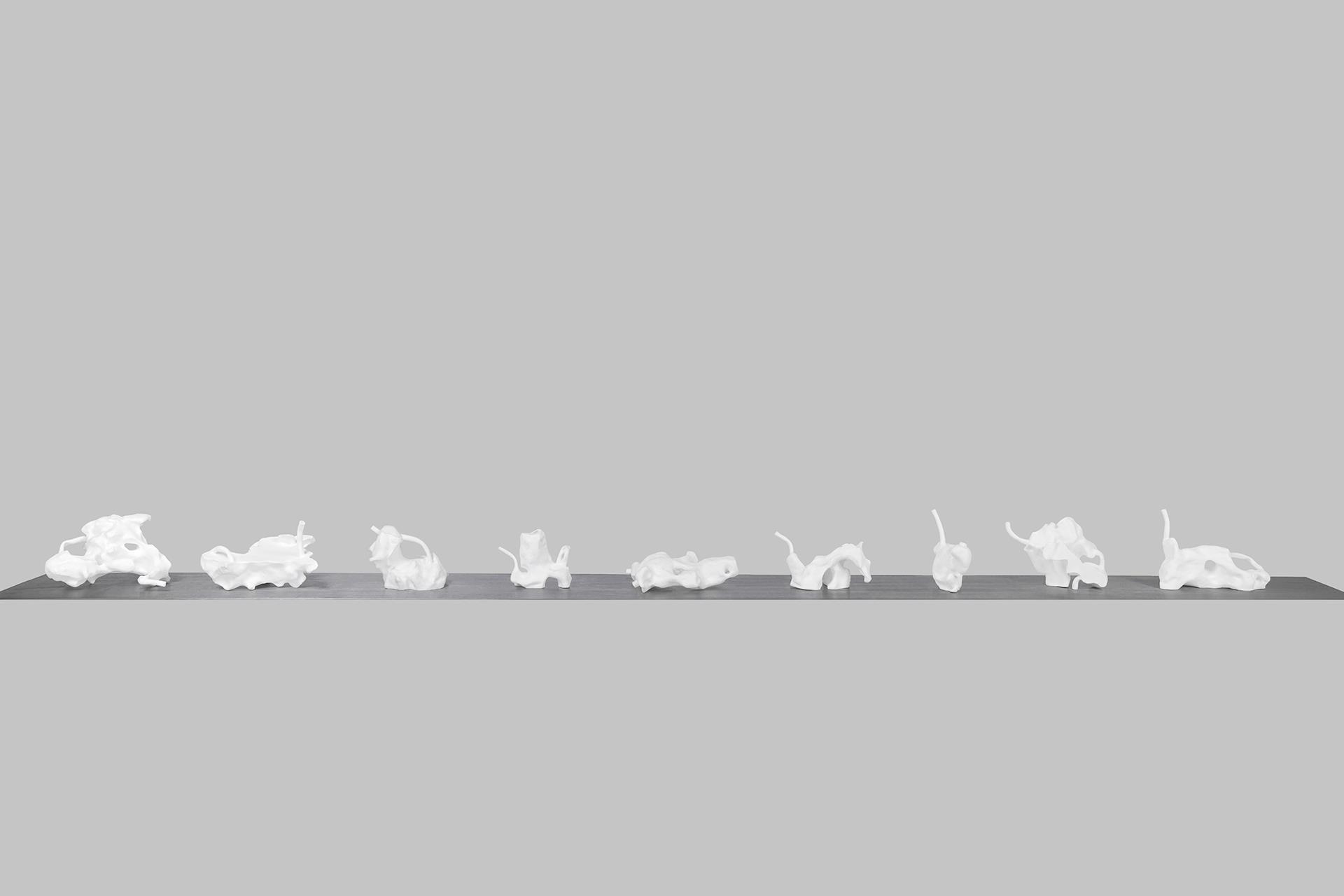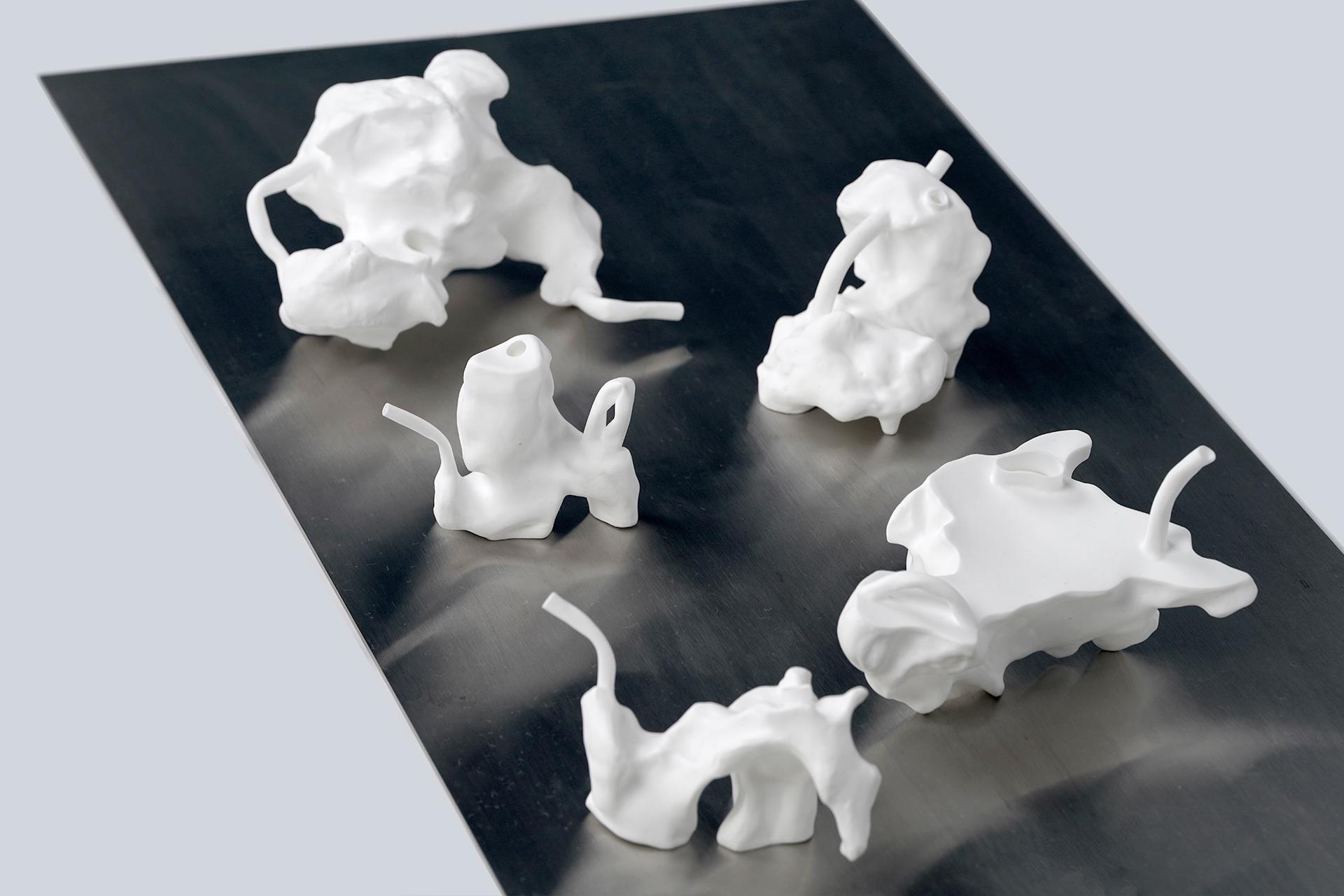 Congcong is a white porcelain sculpture centered around the traditional form of the teapot. The work explores the relationship between the fluidity of water and the containment of vessels. In Eastern philosophy, water is considered formless, able to adapt to any container—symbolizing softness yet the capacity to embrace all things. Traditionally, the teapot is a vessel that holds water, but here, the artist reverses this logic: it is water that gives shape to the pot. The flowing body of water becomes the formal basis for the sculpture, and each porcelain “pot” emerges not from utility, but from a moment when water solidifies into form. The resulting forms are abstract, dynamic, and organic, presenting white porcelain bodies shaped by the essence of water itself. The pure and ethereal quality of porcelain lends the static objects a hidden sense of motion—as if the gentle murmur of flowing water (Congcong) still echoes within the body of the pot. This work invites viewers to reflect on the shifting boundary between form and formlessness, function and concept.