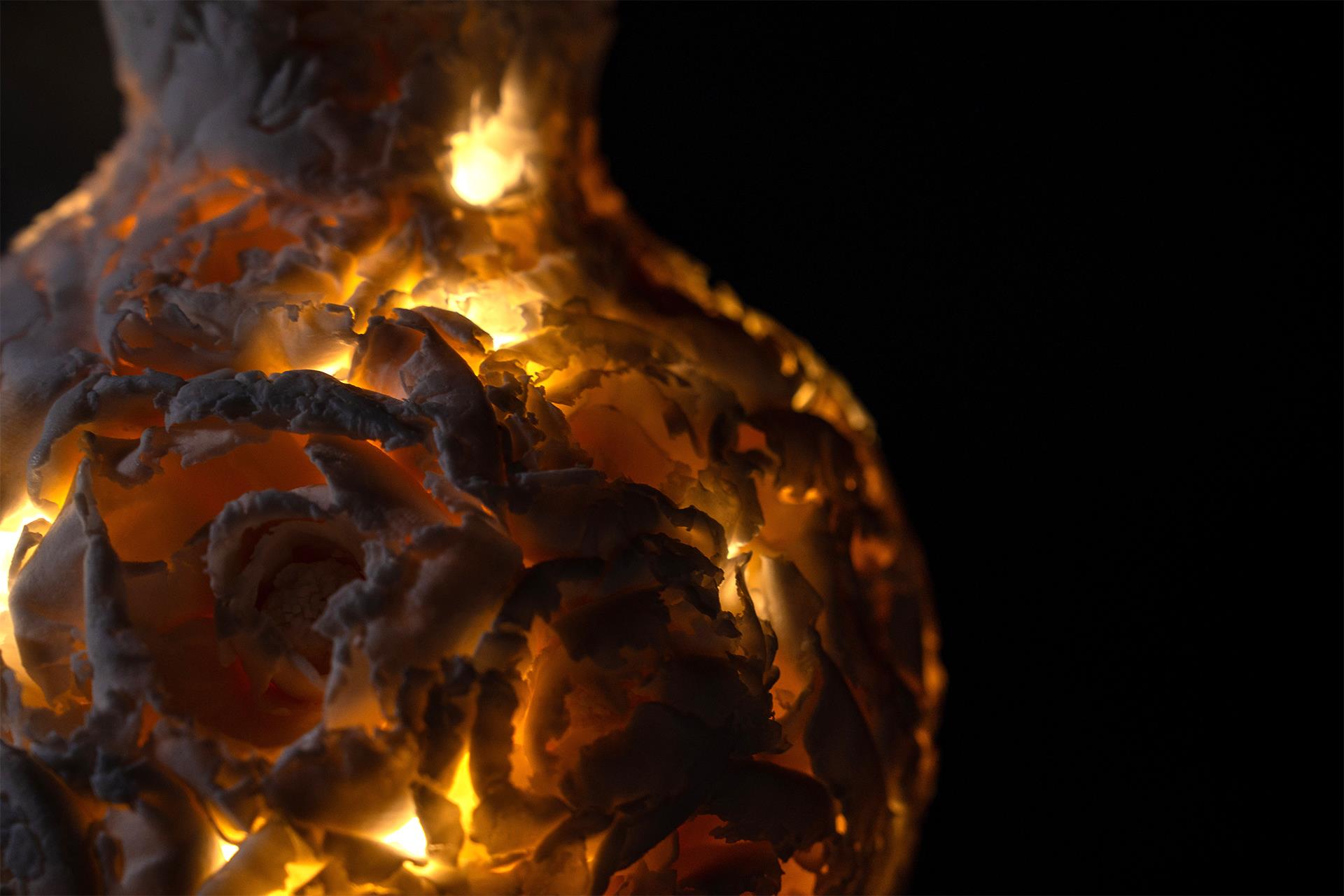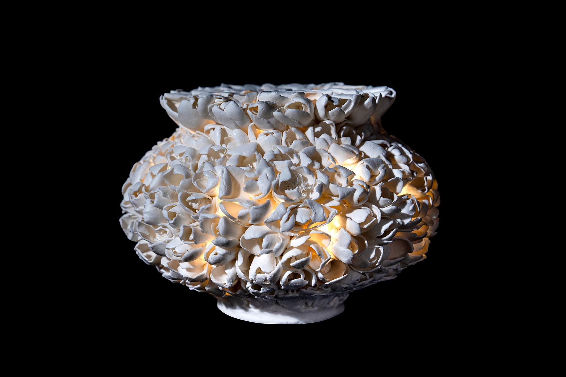 Using Dehua white porcelain clay as the medium, the work interprets the contemporary female spirit of "softness bearing weight" through the technique of hand-molding flowers. Dehua white porcelain is renowned as "China White", and the smooth and lustrous texture of the clay is akin to the delicate yet resilient essence of women. In the creation process, thousands of ceramic flowers were hand-molded, with each petal's texture following the natural shape of a flower. However, during the assembly into a bottle, a gradient compression technique was employed to cause structural deformation. The cracks along the edges of the petals and the distortion of their arcs mirror the invisible pressure that women endure in their multiple roles in society. The bottle's shape breaks away from traditional vessel forms, using clusters of flowers as the basic unit. Through the tension control of ceramic forming techniques, the contradiction and unity between "individual blooming" and "overall shaping" are achieved. The brokenness of a single flower and the integrity of the bottle form a mirror image, not only showcasing the meticulous detailing of the hand-molding technique but also using the metaphor of "a thousand flowers forming a vessel" to pay tribute to the life aesthetics of women who transform their scars into strength under pressure. This work connects the traditional craftsmanship of Dehua white porcelain with contemporary social issues, making "China White" not only a symbol of material but also a visual carrier of the female spirit.
