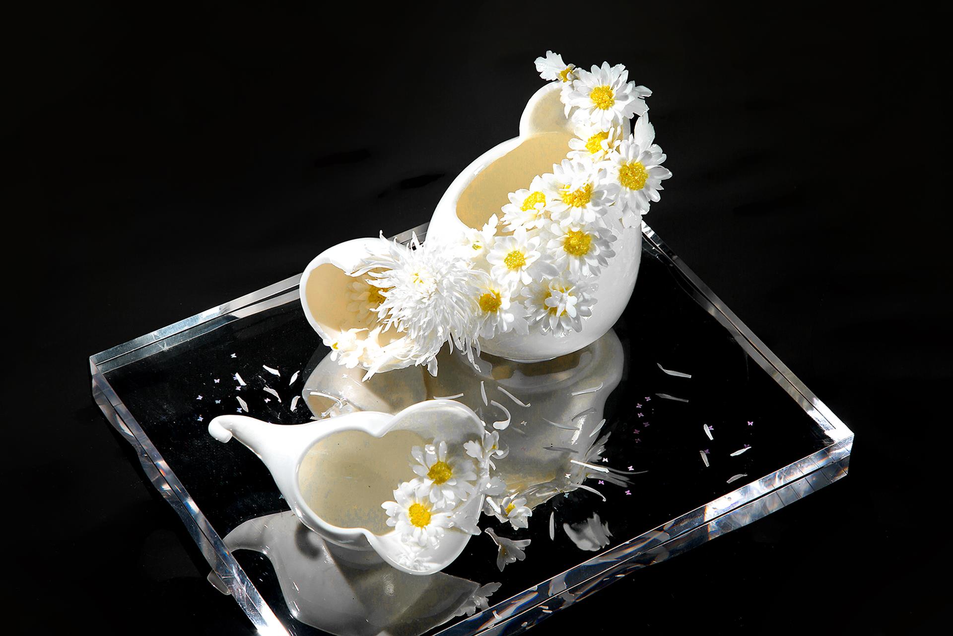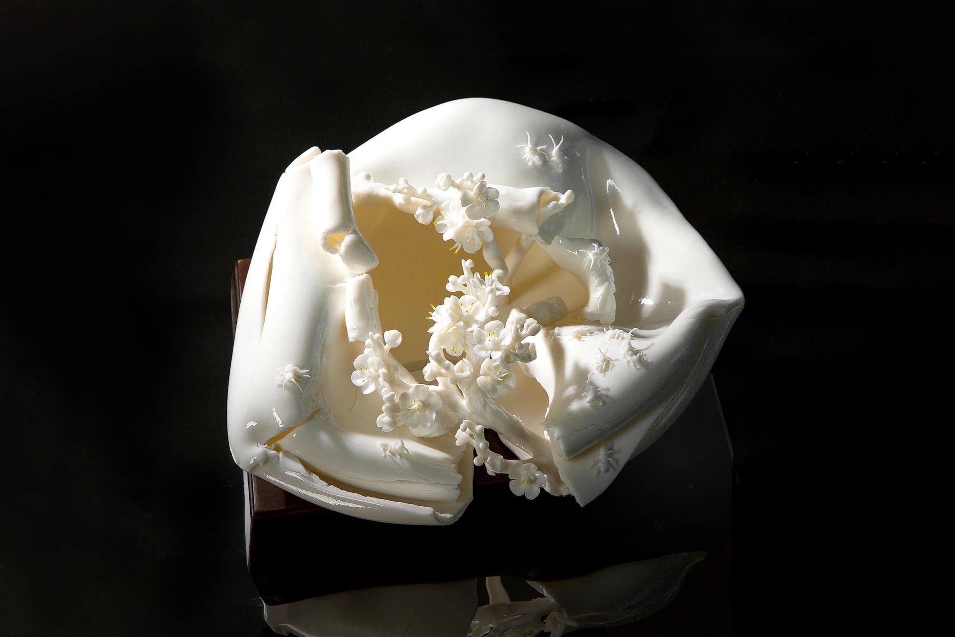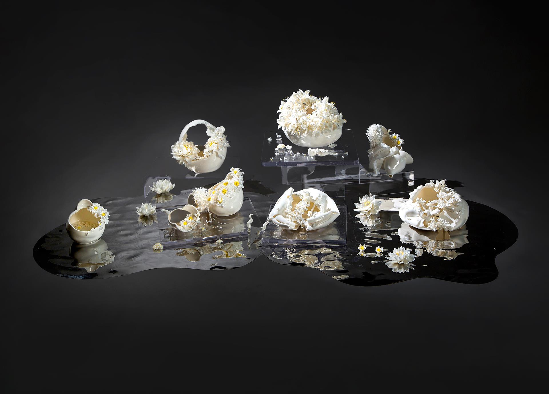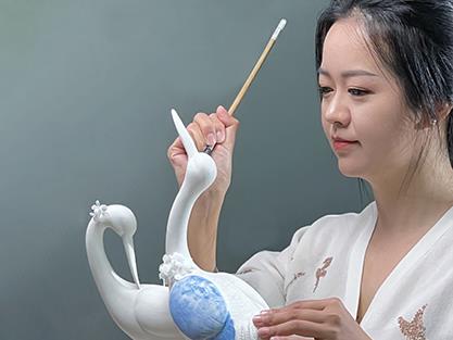 《Life Series: Whispers》This creative design employs ceramic art to interpret the symbiotic beauty of natural life through traditional craftsmanship and hand-sculpting techniques. It conveys the cycle of life through the *sound of withering* – flowers that bloom and bear fruit across four seasons evolve through varied **pinched-flower designs**. Ants traverse along organic pathways, forming a micro-network pulsing with energy flow. A pure white base metaphorically embodies life’s pristine essence. The pedestal integrates **projection technology** that casts water-like ripples, merging **illusory reflections and tangible ceramics** to create an "underwater mirage." This simultaneously echoes water as the source of all life and reconstructs the spatial narrative of traditional vessels through light interplay. Subtly, the piece mirrors contemporary reflections on existence.