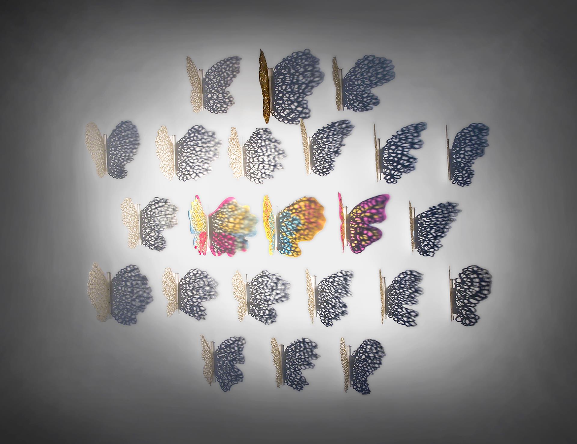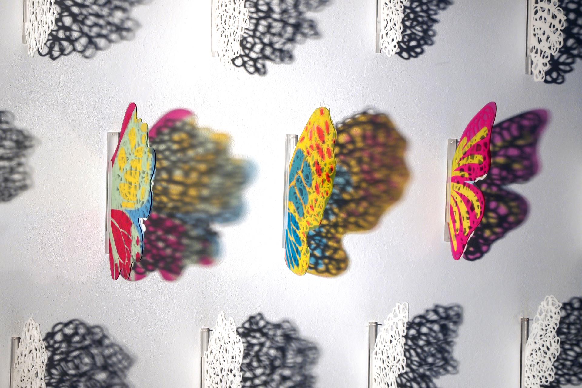 My research is developed through illusory and light works that refer to the ephemeral nature of ceramics. The wall installation “Butterflies in Flight,” was made by combining one wing of the butterfly made of porcelain and Plexiglas and the other only virtual because it is generated by its own shadow created by a side light. Poetry and emotion are the main elements: one part of the work is real while the other is temporary because the shadows are ephemeral and elusive. In Greek mythology, the butterfly is a symbol of the soul, lightness and volatility of the vital spirit. The butterfly is also a symbol of fragility, of beauty but also of the brevity of life, of non-permanence but also of happiness. The butterfly is the personification of the breath of the soul. In this way, the expressive and metamorphic world of shadows is evident. As a ceramic artist, I have developed some personal techniques, working mainly with porcelain and experimenting with paper clay. The butterflies are made with a syringe for spreading slip.