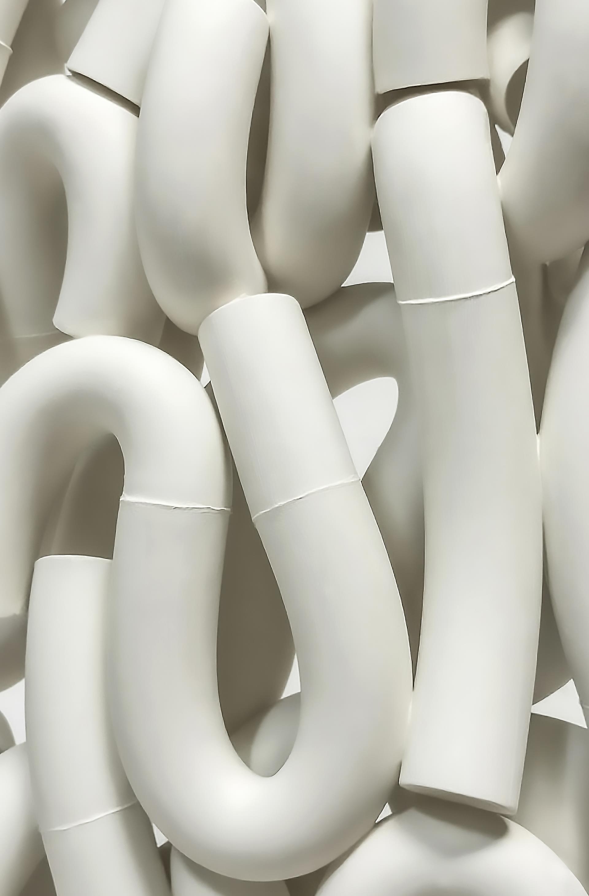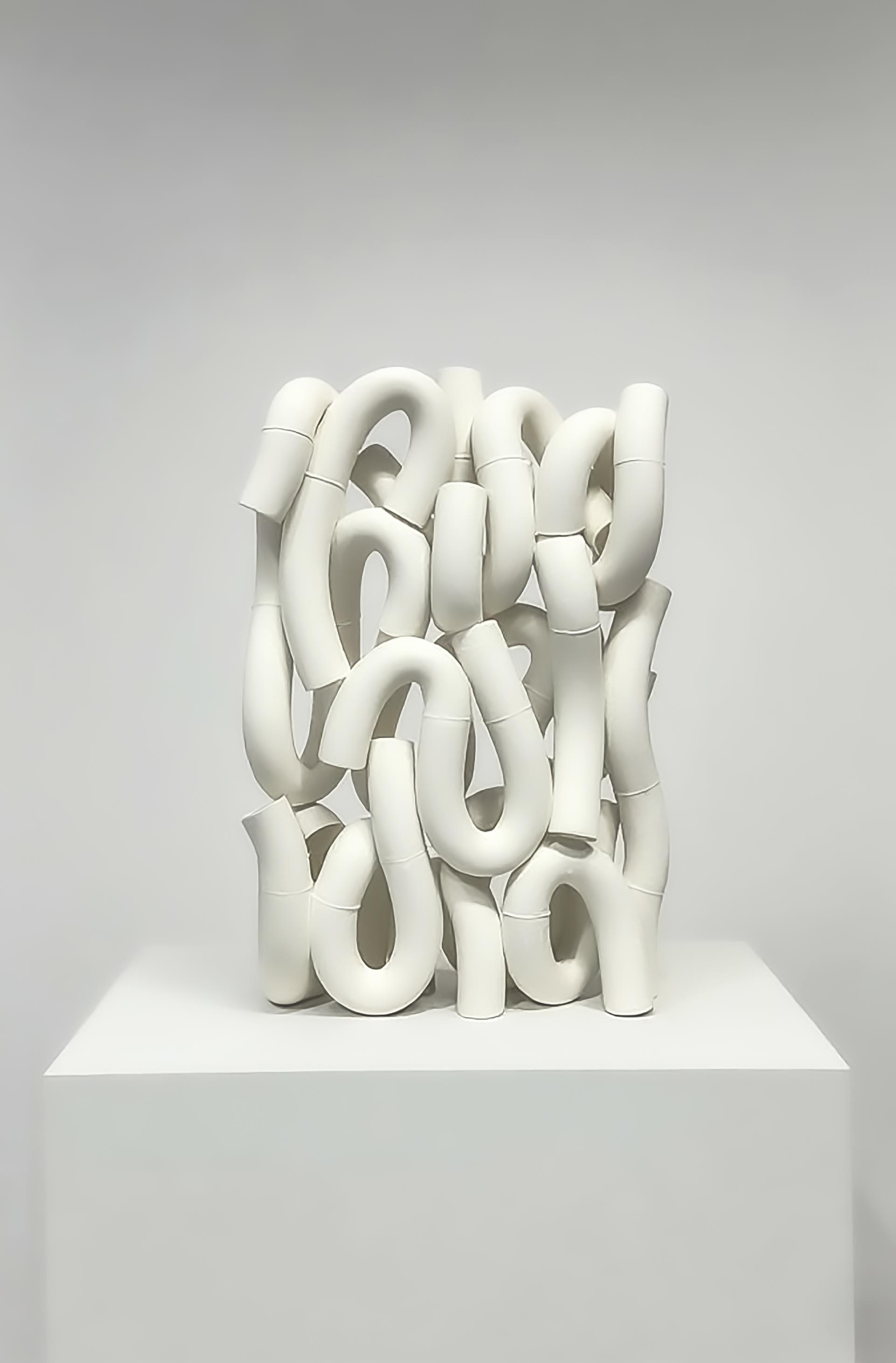 "Entwined" from the "Tube Series" uses clay as the medium to explore the extension, entanglement and breathing sensation of tubular forms in space. The work is composed of several ceramic tubes that exude a vibrant sense of life. These tubes are not rigidly arranged but naturally coil and nestle against each other like vines, creating a dynamic organic structure. It is as if breaths linger and flow in the space, or as if life's veins are silently growing and connecting. The surface of the tube walls deliberately retains the marks left by the ceramic slip casting process, and is decorated with pure white ceramic slip. Through the stacking of the tubes, a rich yet restrained texture and play of light and shadow are formed, hinting at the accumulation of time and the surging of inner energy. "Yíng" implies entwining and meandering. The work aims to transform the intangible "entwining" - such as thoughts, breaths, emotions, and the passage of time - into tangible forms through the primitive yet warm material of clay. It is not only the construction of spatial structure but also a visual metaphor for the inner spirituality, inviting viewers to quietly experience the serenity and remoteness that linger beyond the physical forms and entwine in the heart. Through the balance of hardness and softness, reality and void, movement and stillness, it conveys the unceasing vitality and poetic philosophy of Eastern thought.