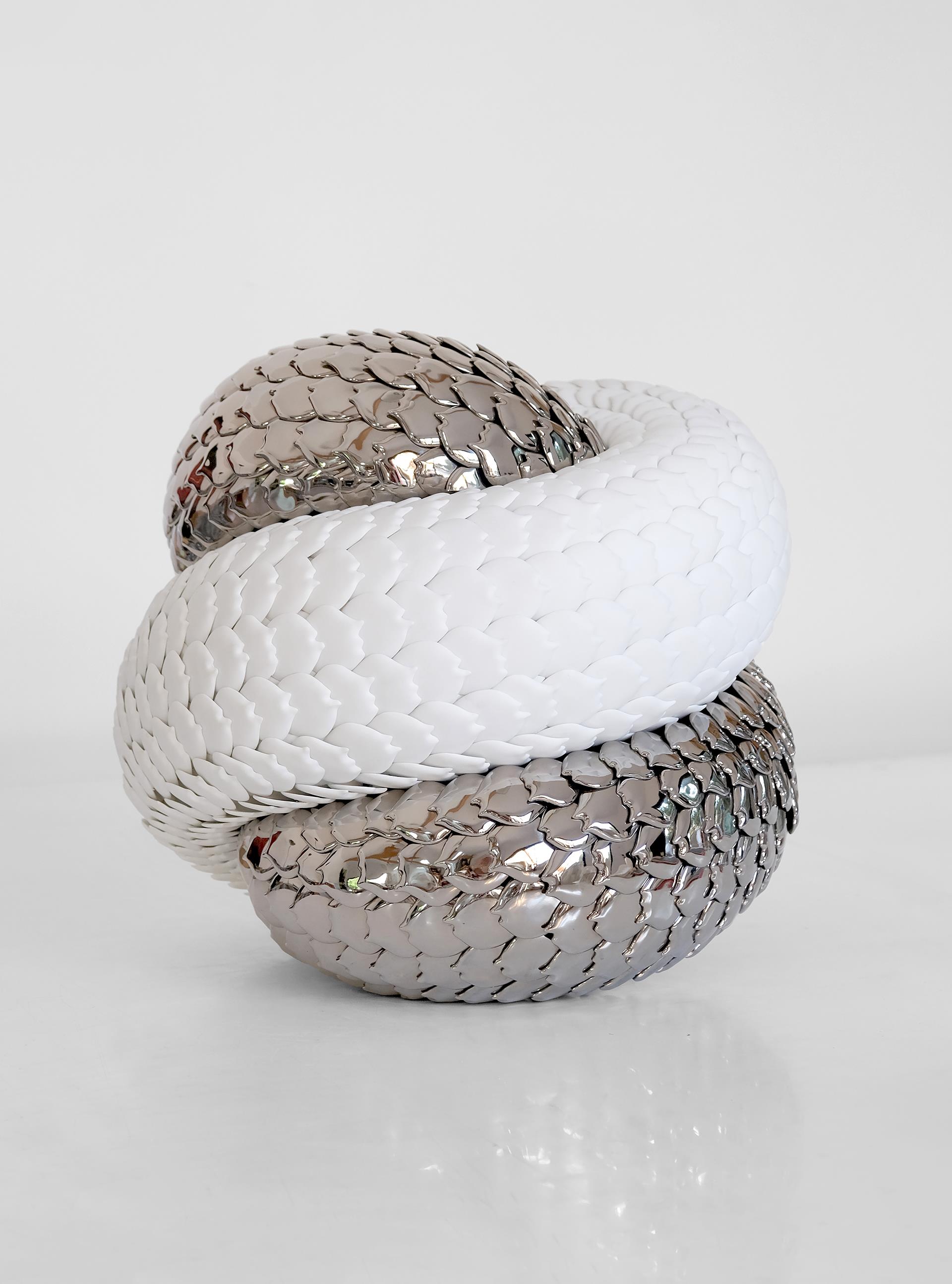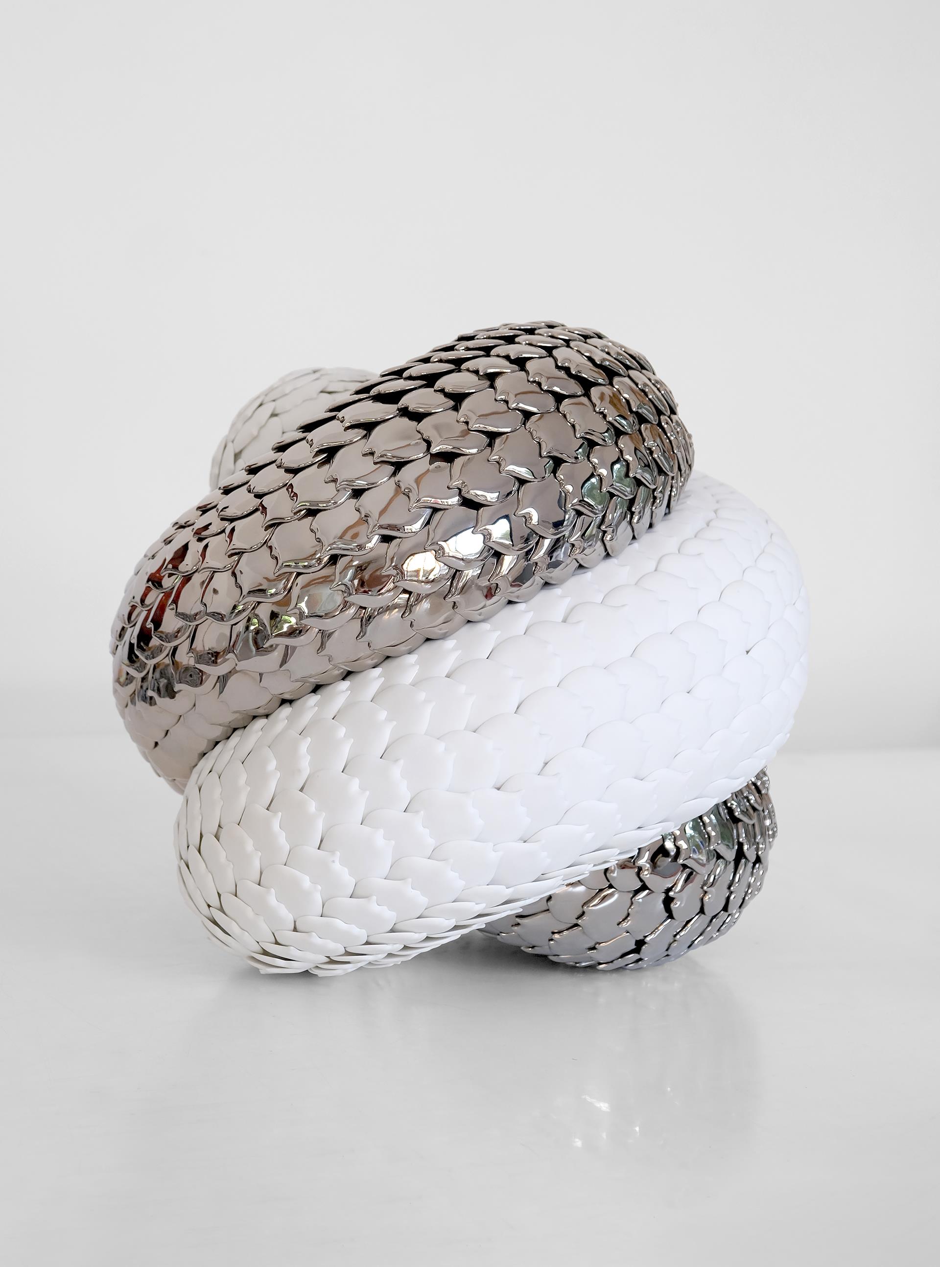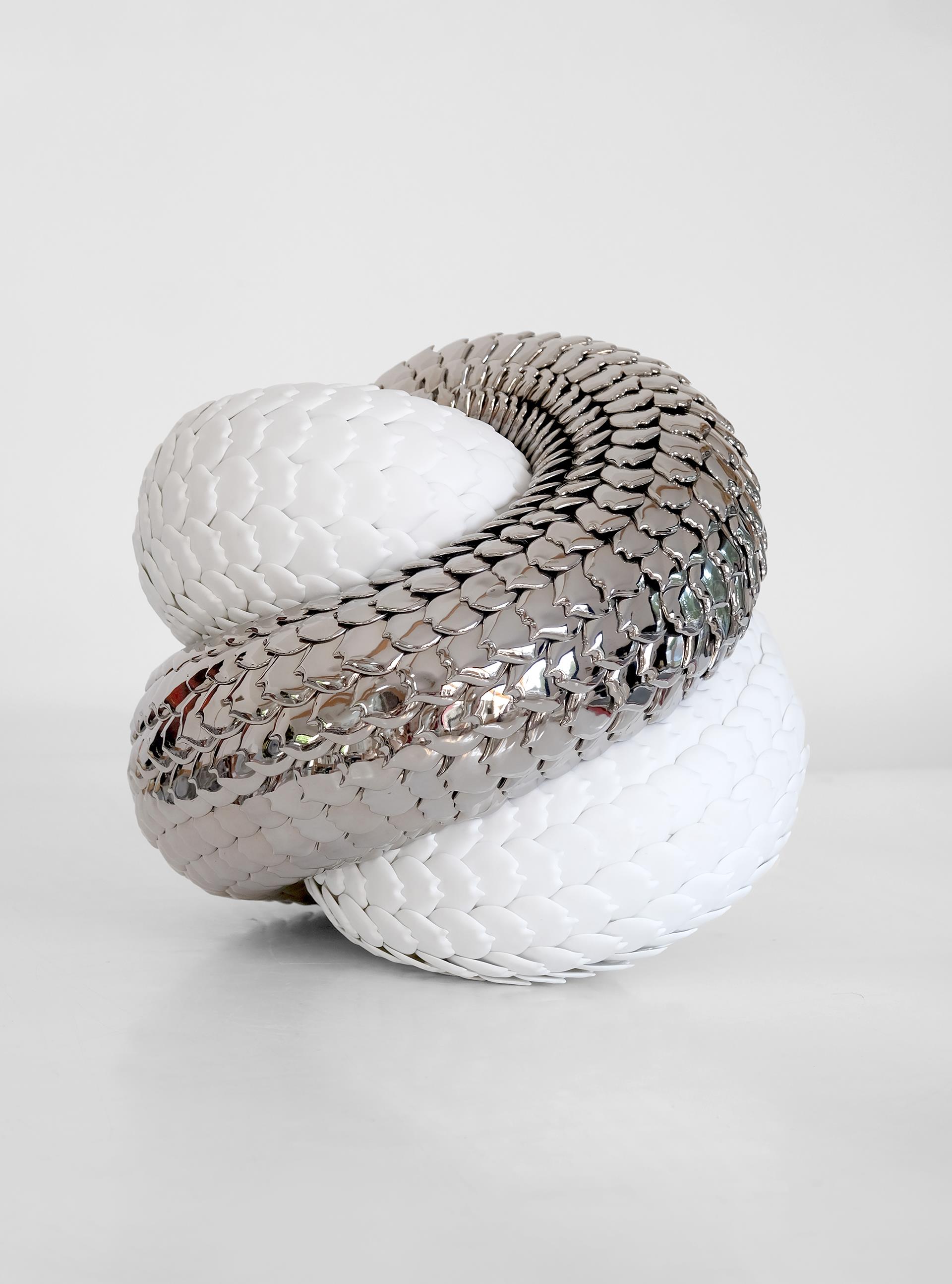 Born in 1978, I am a French visual artist and ceramist. After 10 years working on other mediums, I came across porcelain in 2015. For 4 years, I was artist-in-residence in a Limoges porcelain factory, where I learned how to produce cast porcelain, in the pure tradition of Limoges porcelain. Then I began to feel the need to work differently. I knew I wanted to keep porcelain at the heart of my work, but I also wanted to take it elsewhere, to combine it with other materials so that I felt free to explore any kind of form or scale. Since 2019, my porcelain sculptures are made up of thousands of porcelain scales fixed on different medium, depending of which form I want to create. Made in July 2025 for Blanc de Chine, « Echo of a wyrm » is part of my Endless serie. About 1200 high fired (1400°) white porcelain scales composed this sculpture. Half of them are left in white biscuit, while the rest are glazed and covered with platinum luster then fired again at 820°. The main technical challenge was to create the feeling of movement, which is central to my work as a way for me to make the living visible. Each row of scales is first drawn then accurately laid. I fixed one by one each porcelain scales with silicon and long pins on a hand sculpted foam. This structure allows me to create complex and light shapes. Deeply inspired by Asian philosophies, particularly the 2 concepts of Yin & Yang and Samsara, my current work explores 2 main lines: the idea of cycle of life which is incessant and universal, and the perpetual search for a balance born from contrasts and oppositions. « Echo of a wyrm » is the perfect expression of this. Like an infinite knot, a never-ending cycle, this sculpture has neither beginning nor end. An hybrid, endless and reptilian creature born from intertwined forms. The impression of strength and power is palpable. But the delicacy and fragility of porcelain soften this tension. Strength and fragility are balanced to give life to a new form of harmony.