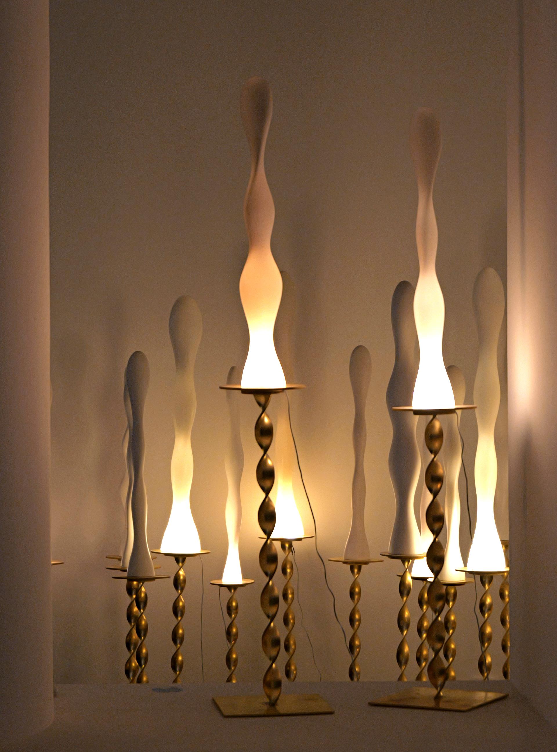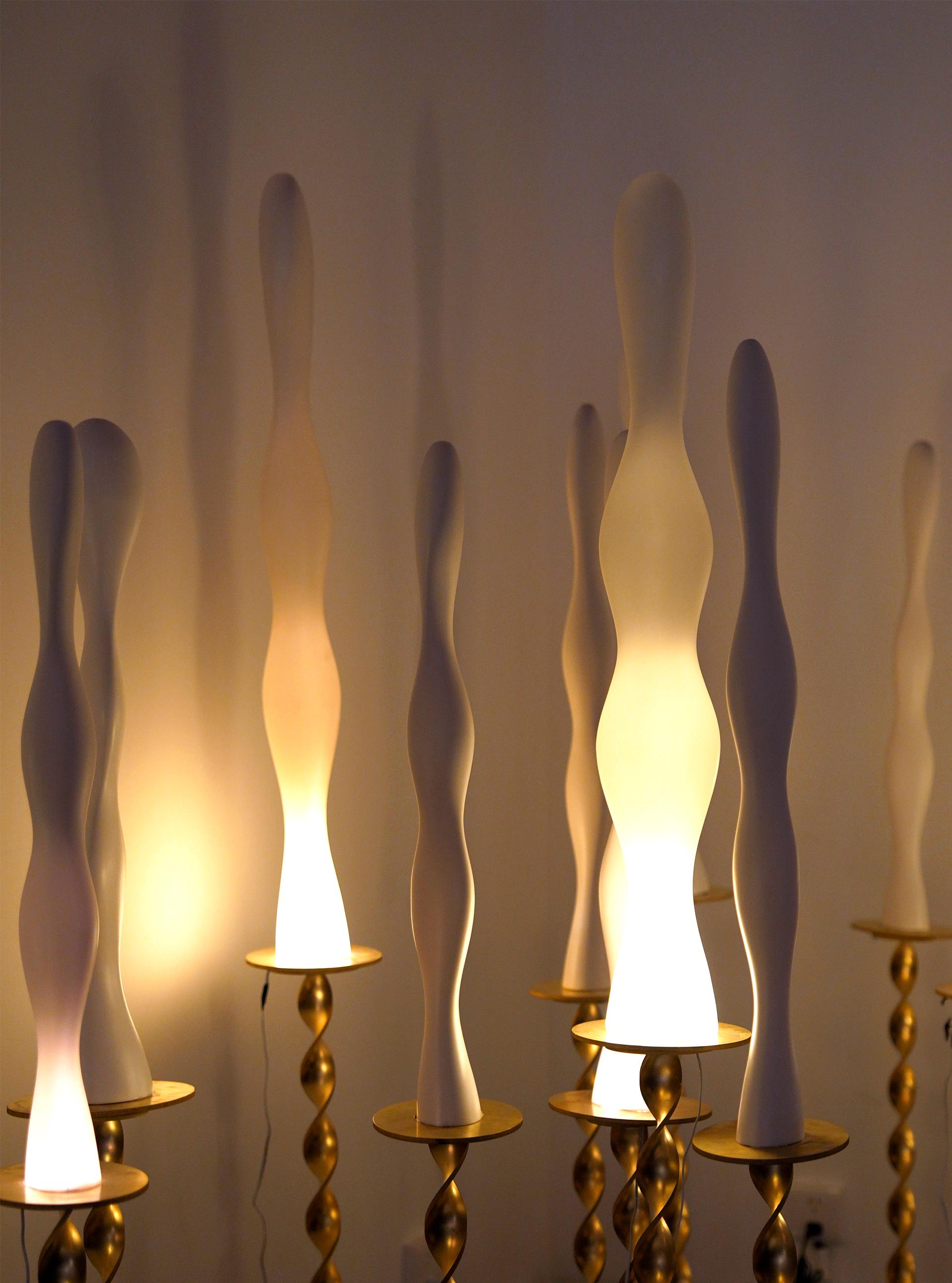 《Valdrada》 (Ceramic, Brass) This luminaire design by the artist, influenced by Isamu Noguchi's "Akari" light series, explores the expressive potential of ceramic materials. Its form draws inspiration from the reflection-famed city in Italo Calvino's 《Invisible Cities》, featuring a distinctive symmetrical structure:The upper section, crafted from warm Dehua white porcelain with sinuous contours, embodies metaphors of eros, nobility, and fragility. Below, polished brass forms a cold helical structure culminating in a mirror surface. With surgical precision, the brass mirror replicates yet distorts and deconstructs the porcelain morphology above—creating a dialogue between appearance and essence, reality and reflection.A precisely calibrated balance between poetic abstraction and technical specificity