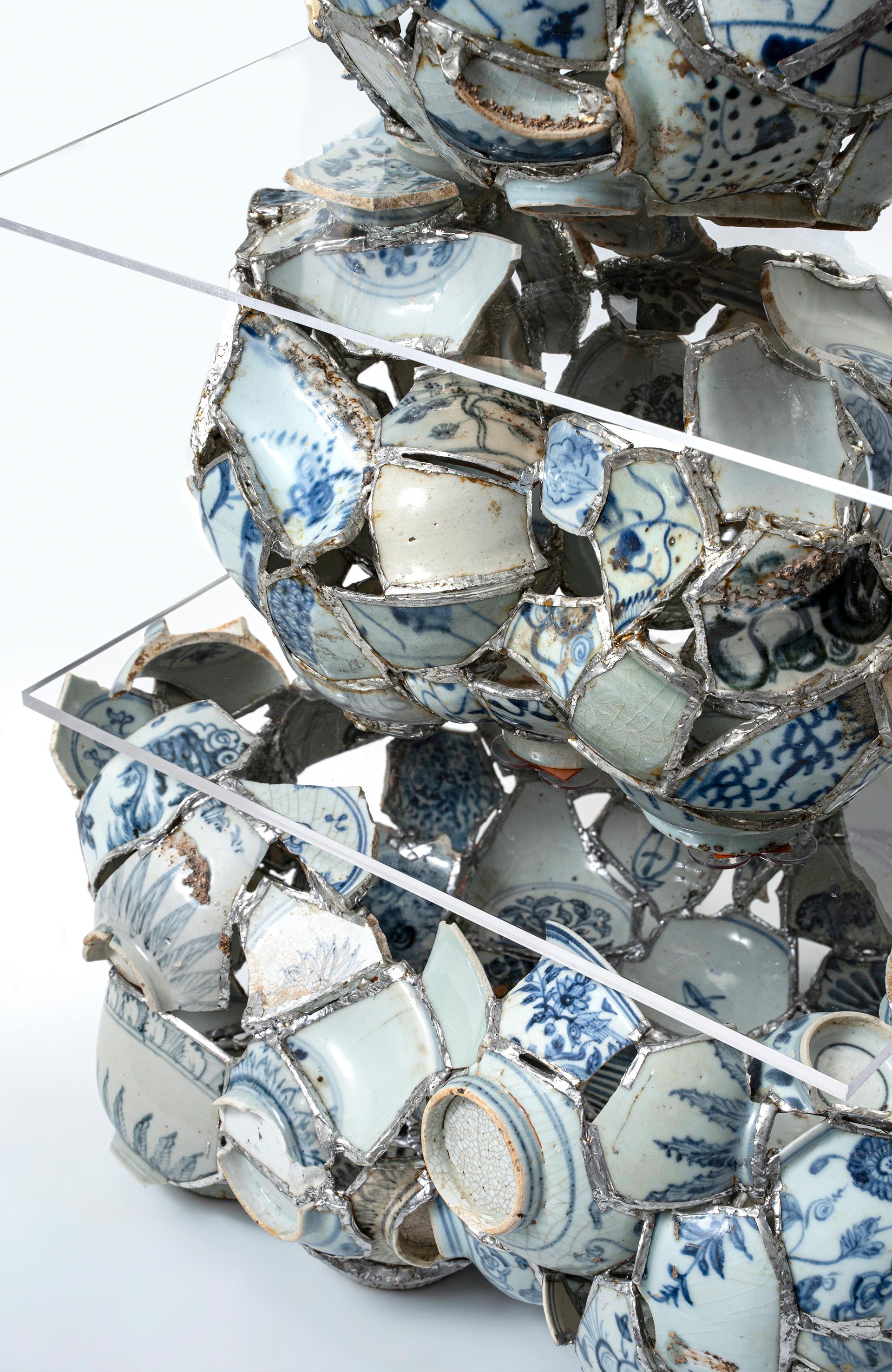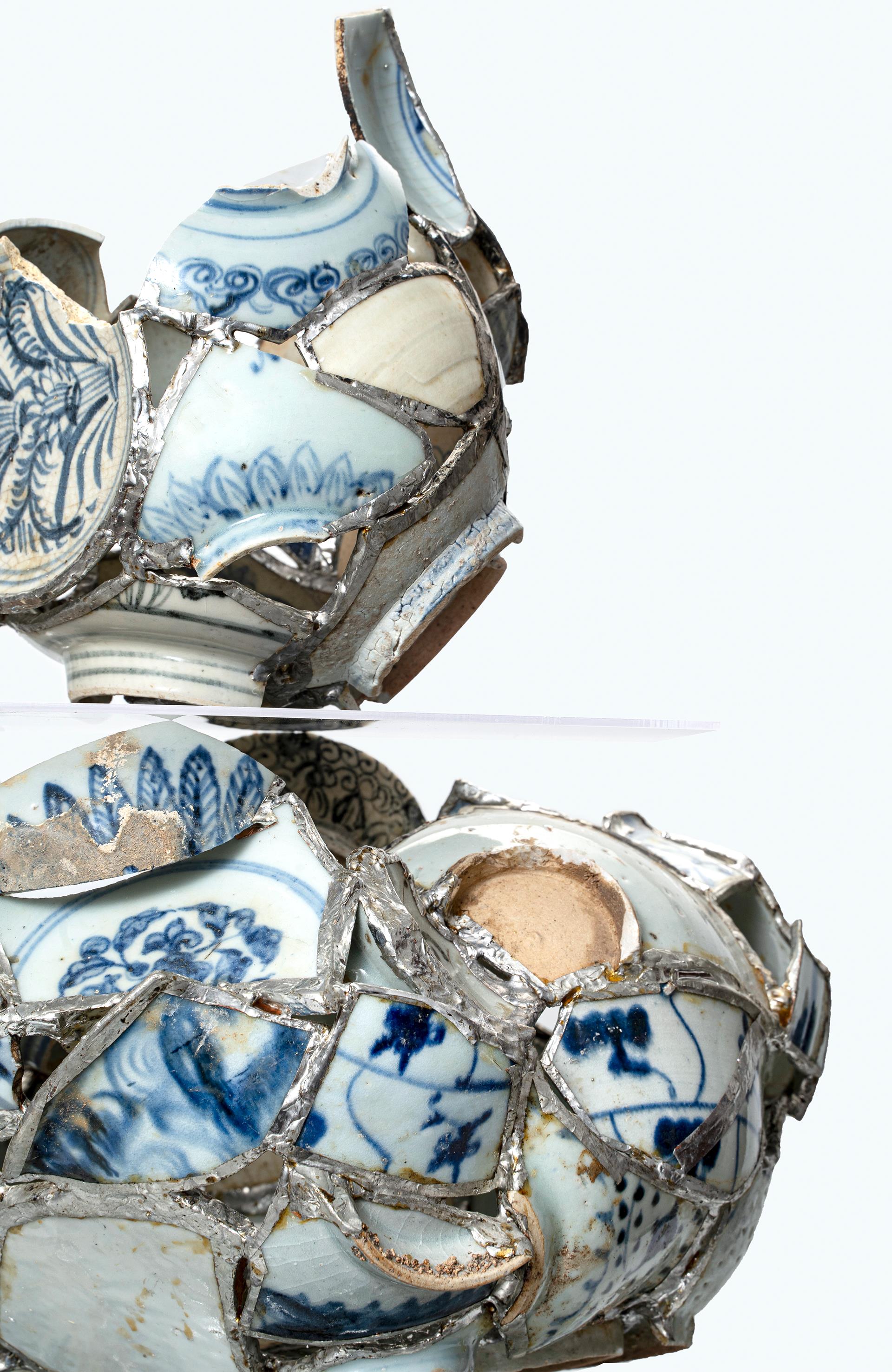 This work uses ancient ceramic shards from Jingdezhen as its primary medium, with each fragment originating from the Yuan, Ming, or Qing dynasties. These pieces have borne witness to the evolution of history and the transmission of craftsmanship. The fragments, weathered by time, are dismantled, reassembled, and welded into a structure that appears random yet carries an underlying logic—like a fragmented but continuous cultural phrase being spoken anew. The title “Cultural Puzzle” symbolizes the recombination of broken ceramic pieces to reconstruct a complete cultural context, reflecting the regeneration and innovation of traditional craftsmanship under contemporary aesthetics. The term “Fragmented Phrases” brings a poetic nuance to the work, suggesting that each shard is more than a physical remnant—it carries with it layers of historical memory and regional identity, conveying the legacy and depth of ceramic culture. By incorporating glass welding techniques, the piece highlights a dialogue between materials, where the collision and fusion of porcelain and glass embody a technical and artistic intersection. Through the rebirth of fragments, the work metaphorically explores the transmission of cultural memory, presenting a contemporary artist’s deep reflection on traditional craft, local heritage, and the spirit of the times within a globalized context.