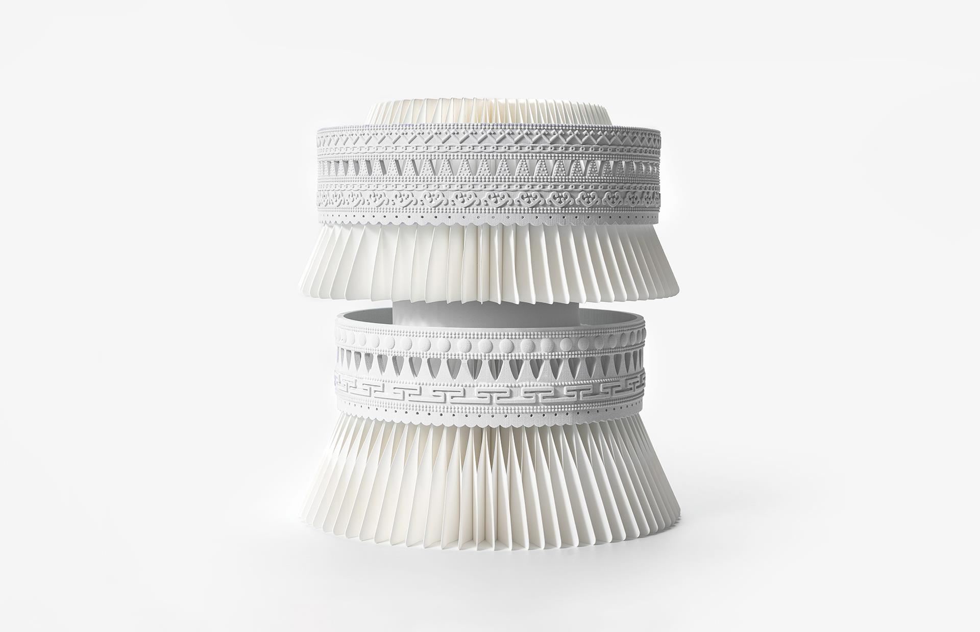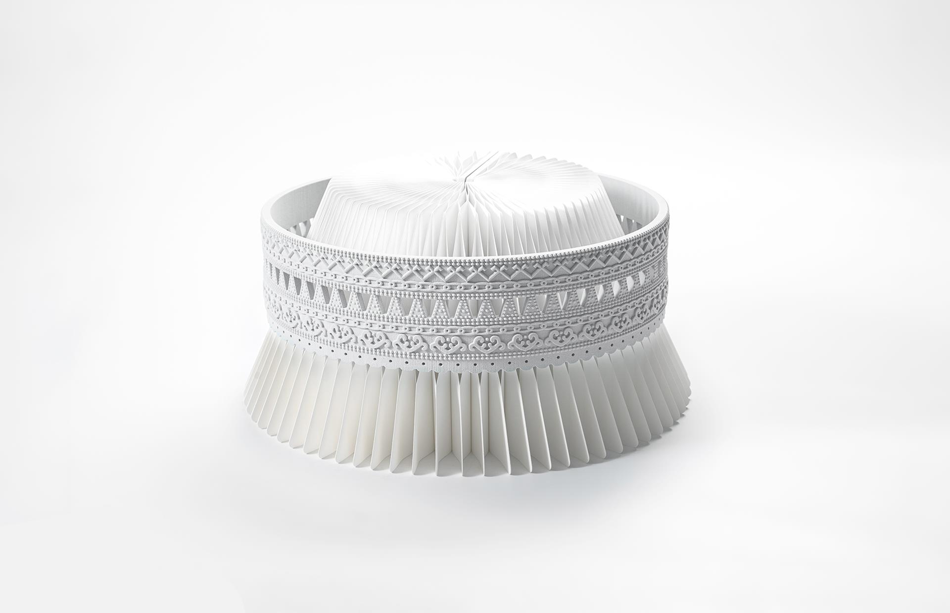 This work is inspired by the traditional headwear of Yi women from Liangshan, China. As the Yi ethnic group reveres the color white, white porcelain is chosen as the medium to explore the contemporary expression of ethnic symbols. The overall form draws reference from the iconic "moon crown" shape, symbolizing the gentle yet mysterious cultural connection between women and the moon, embodying a sense of serenity, resilience, and purity. In terms of craftsmanship, the work incorporates 3D modeling and ceramic 3D printing technology to digitally reproduce intricate patterns and structures with precision. It is then combined with traditional hand carving and high-temperature firing techniques, enhancing both accuracy and artistic texture. The use of 3D printing not only improves the efficiency and controllability of the creative process but also expands the possibilities of white porcelain in structural expression and lightweight design. This piece aims to bridge tradition and modernity, ethnicity and technology, through a cross-media fusion of white porcelain and silver adornment motifs. It reinterprets the aesthetic imagery of feminine ornaments in Yi culture, allowing the stillness of white porcelain to speak of memory and spirit through light and shadow. The work serves as both a technical exploration of porcelain’s expressive potential and a cultural tribute to the vitality of ethnic art.
